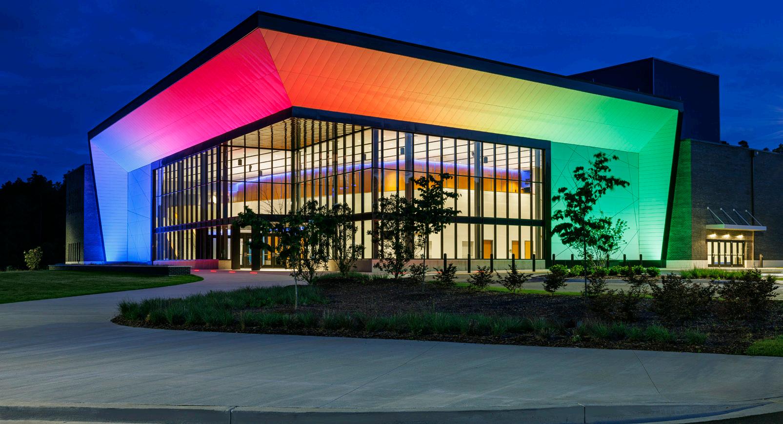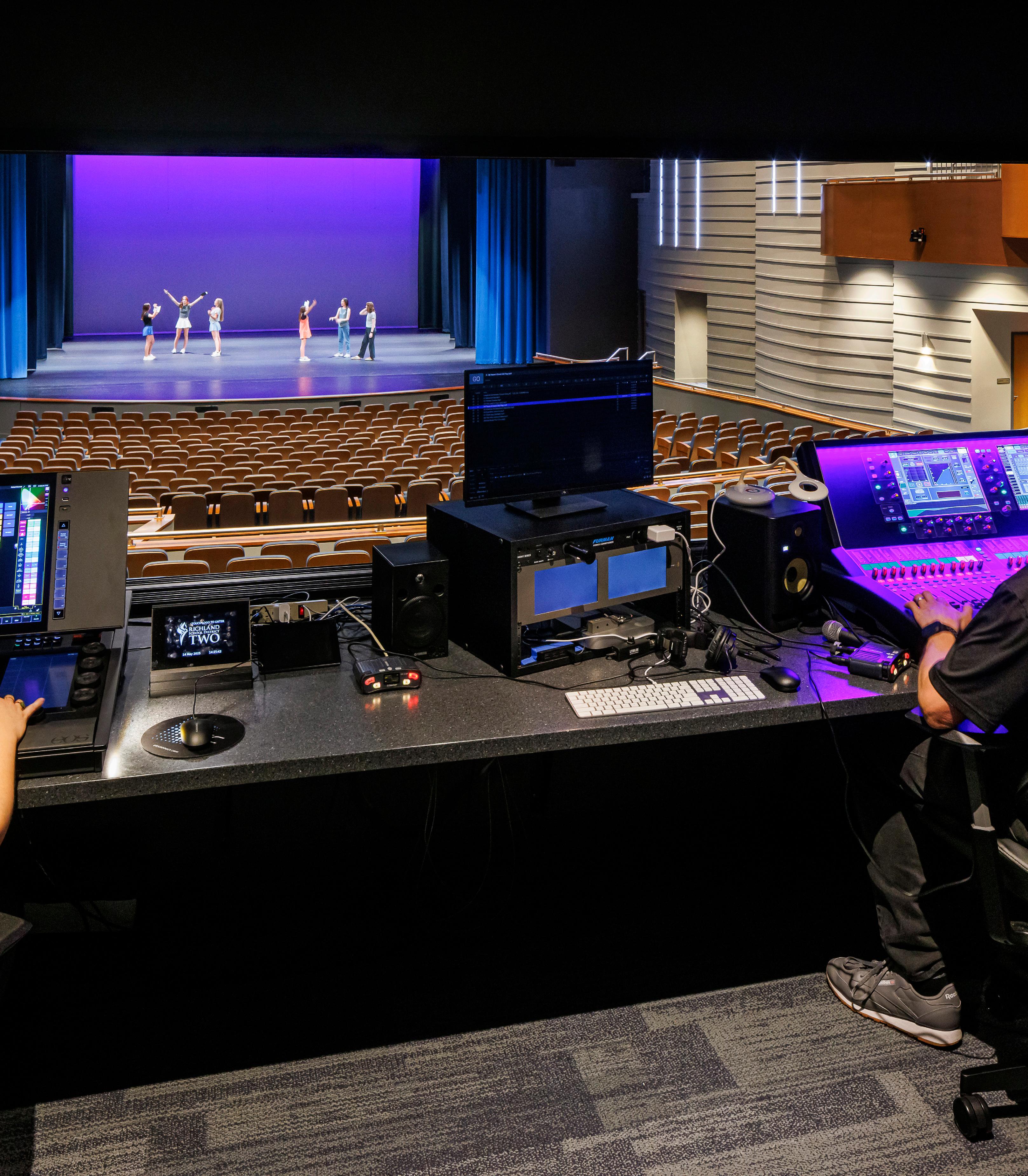 The two-story grand lobby, lit by customizable color-changing fixtures, welcomes audiences for both school and community events. With spaces designed to host everything from district assemblies to regional performances, the center reinforces the idea that a performing arts center can be both a teaching tool and a cultural anchor.