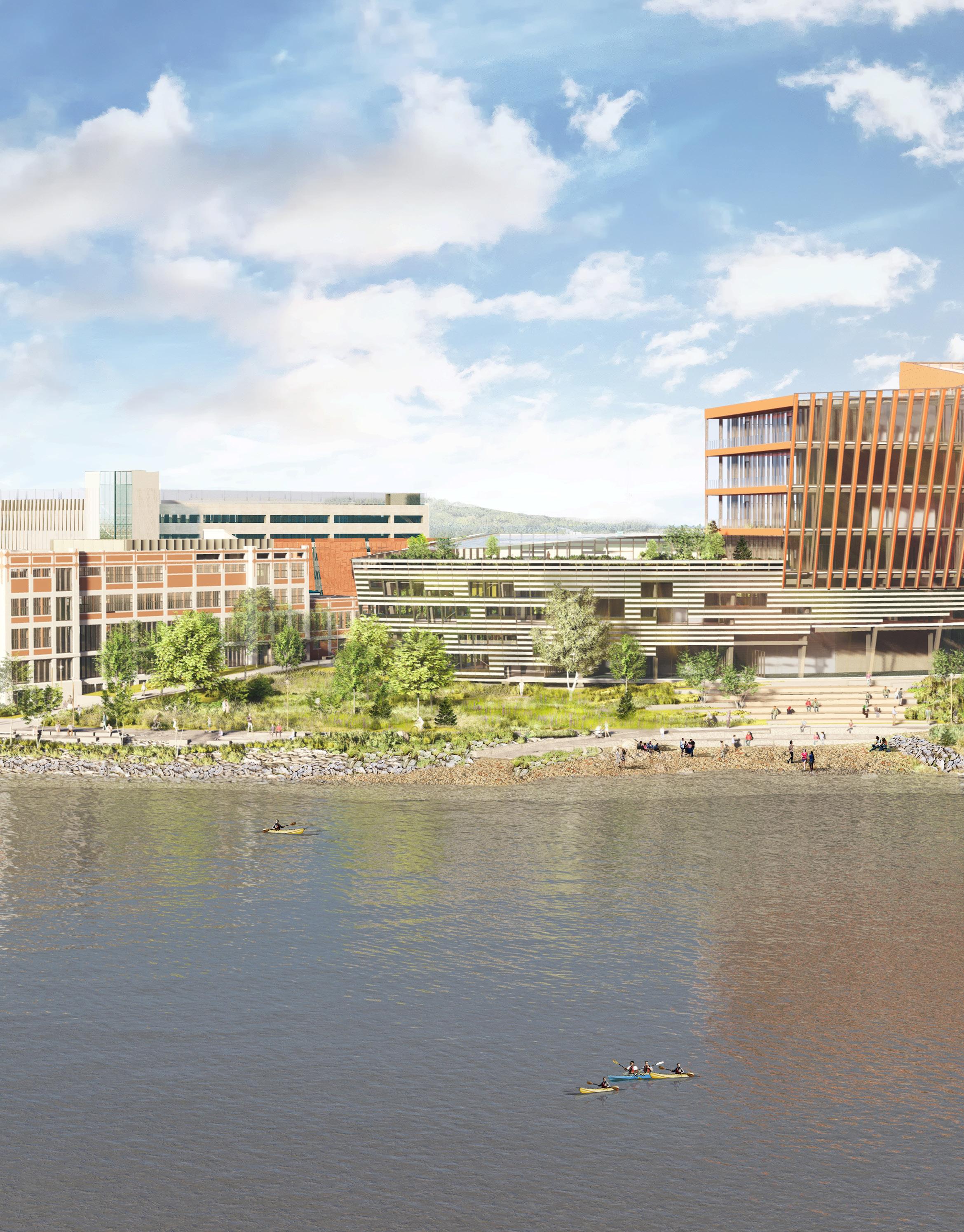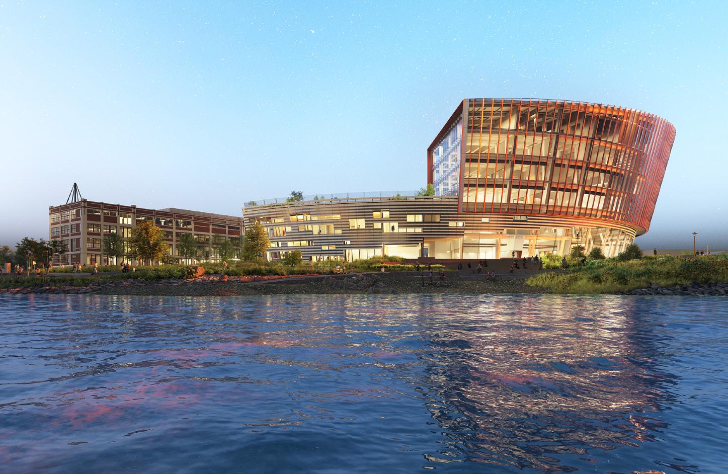Rounding out the campus are a new parking garage and an adjacent childcare center. Public bike paths will hug the shoreline, while green spaces and pedestrian areas will guide students, visitors and community members to a publicly accessible pier.