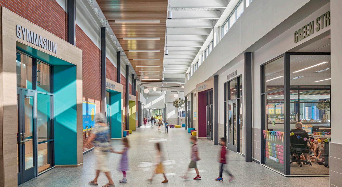 spacious design also incorporates non-flicker LED light fixtures to ensure even light levels, while special attention to daylighting and classroom acoustics creates a calming environment.