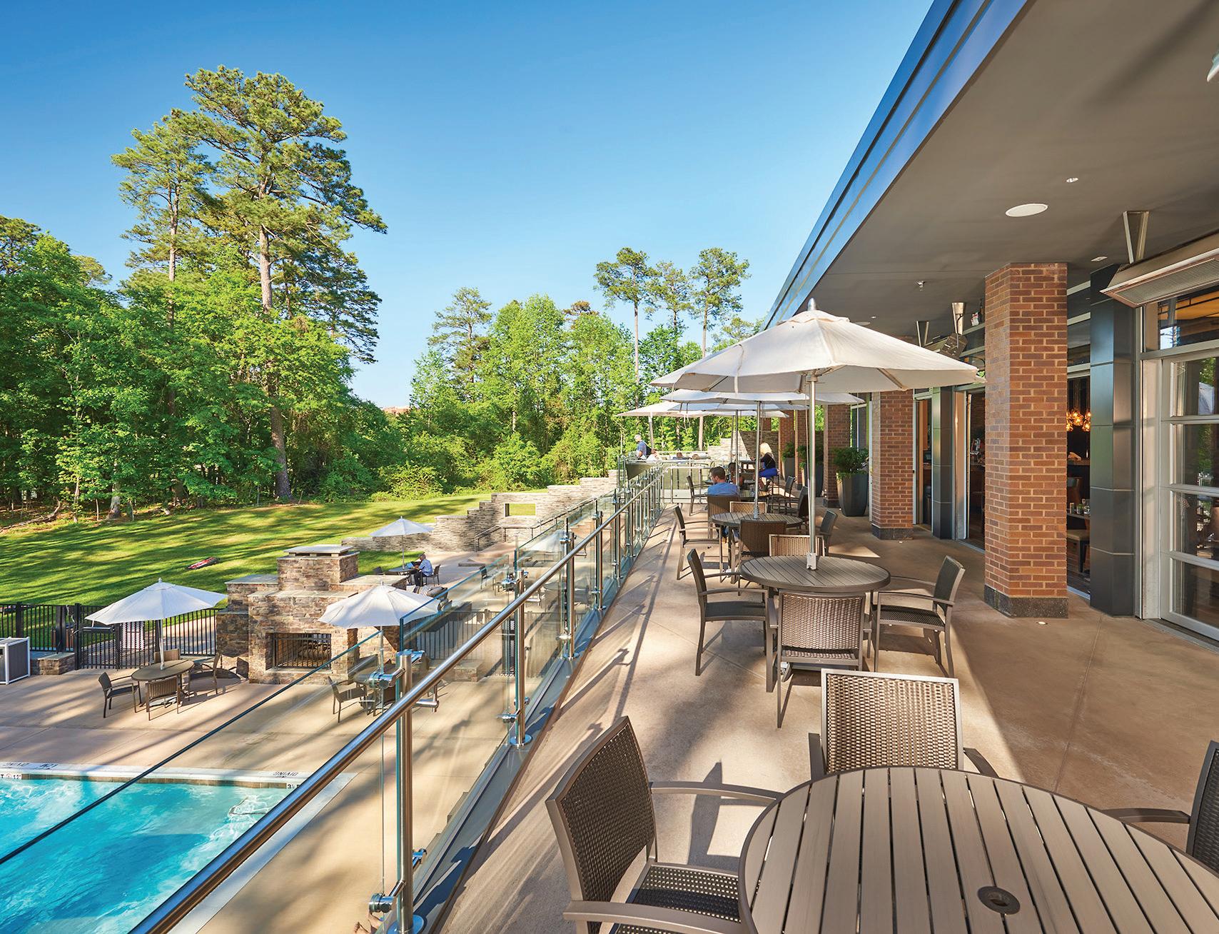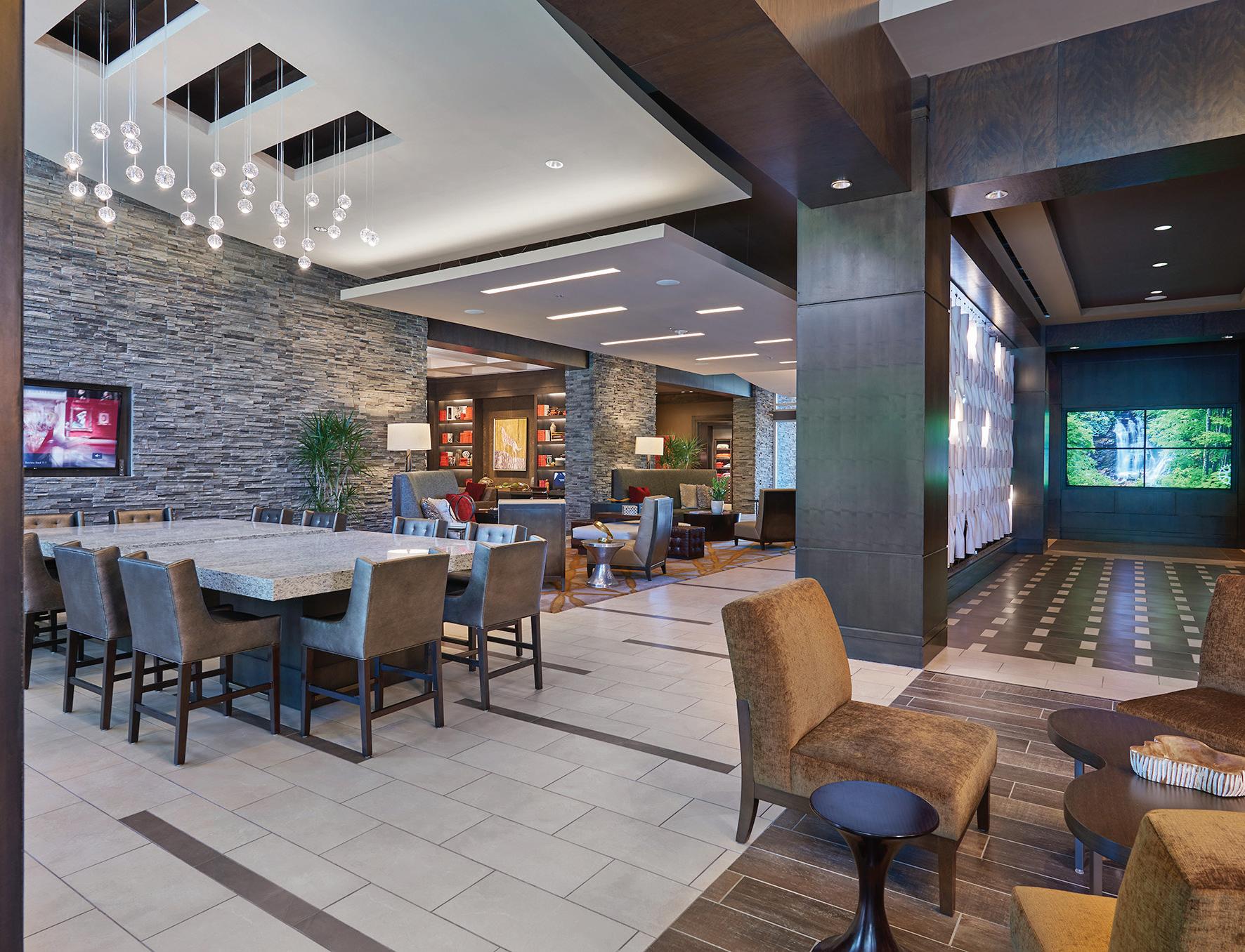 The hotel features a sky lobby concept with ample social spaces. Meeting and event spaces dominate the seventh floor with a conference room, meeting rooms, library, kitchen, main AC Lounge, and outdoor rooftop deck. The Level 7 rooftop bar offers a gathering place for visitors and locals with entertainment and panoramic views of Raleigh’s North Hills neighborhood.