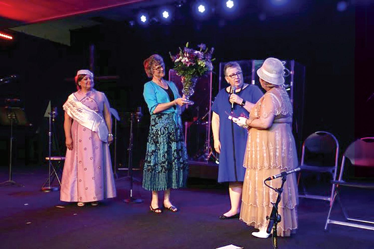 President Shirley McDonald and interim executive directortreasurer Carolyn Porterfield presented an inscribed crystal vase filled with flowers to Bea Mesquias, executive director of Hispanic WMU at their celebration banquet in San Antonio.