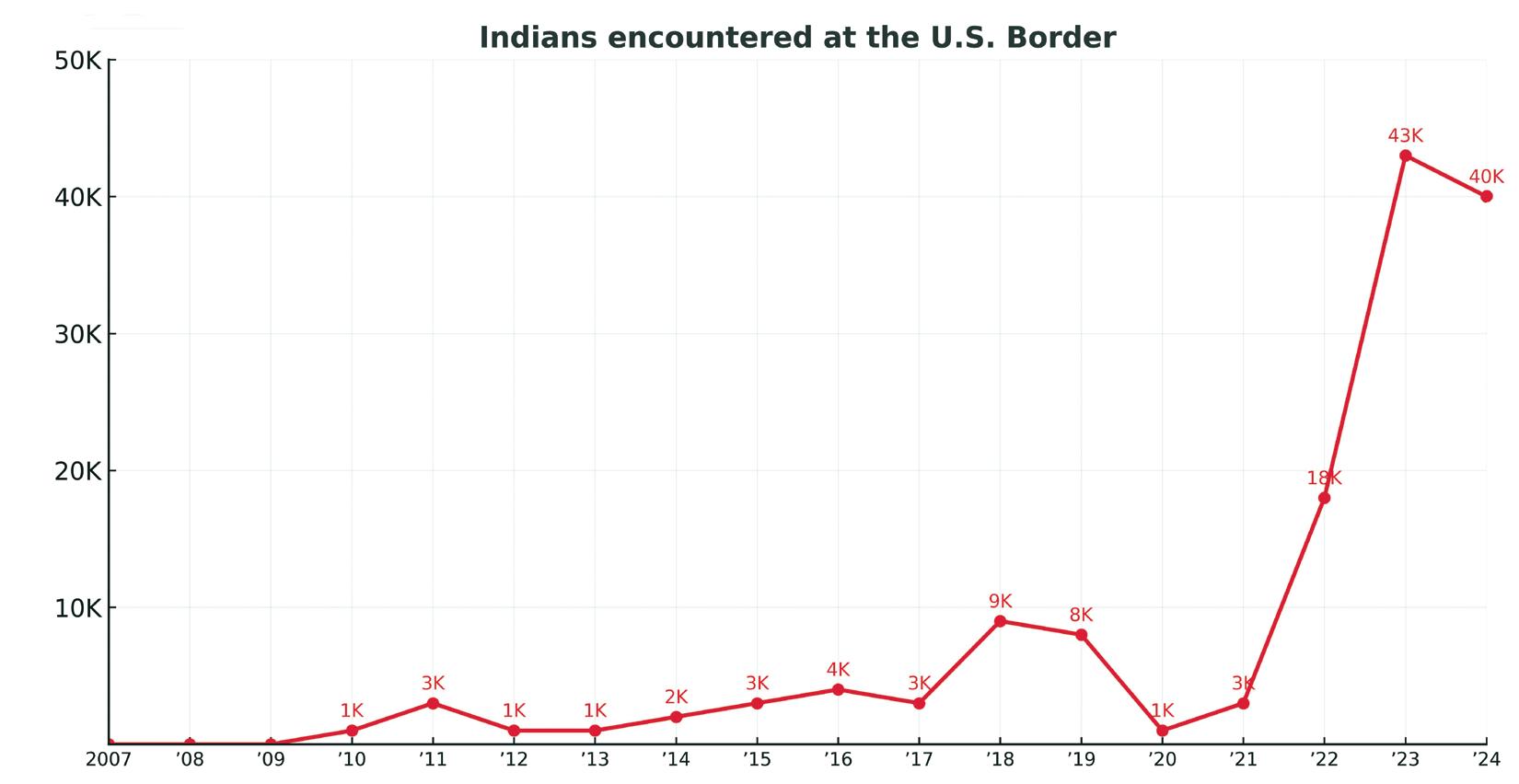 Incredibly, India has now become the third-largest source of undocumented immigrants in the U.S., despite having no direct border with America. Many of these migrants come from India’s middle class, financing their travel by selling land and borrowing heavily. The cultural normalization of this illegal path is deeply entrenched, driven by economic pressures and the growing perception that migration—by any means, legal or illegal—is the only way out. In 2023 alone, Indian apprehensions at the U.S. border surged to 43,000, a 40-fold increase from just four years earlier. A growing share of these crossings now occurs at the northern U.S.-Canada border.