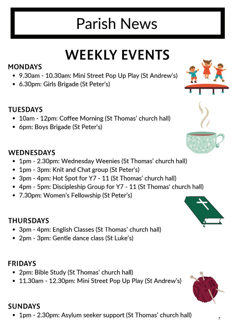 Wednesday Weenies meet in term time from 1-2.30pm in the church hall for our parent and carer toddler group for new-borns to pre-school. With a craft, snack time, story and singing as well as lots of toys to play with.