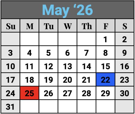 Friday, 5/22: No School - Faculty/Staff Professional Development Monday, 5/25: No School - Memorial Day Observed