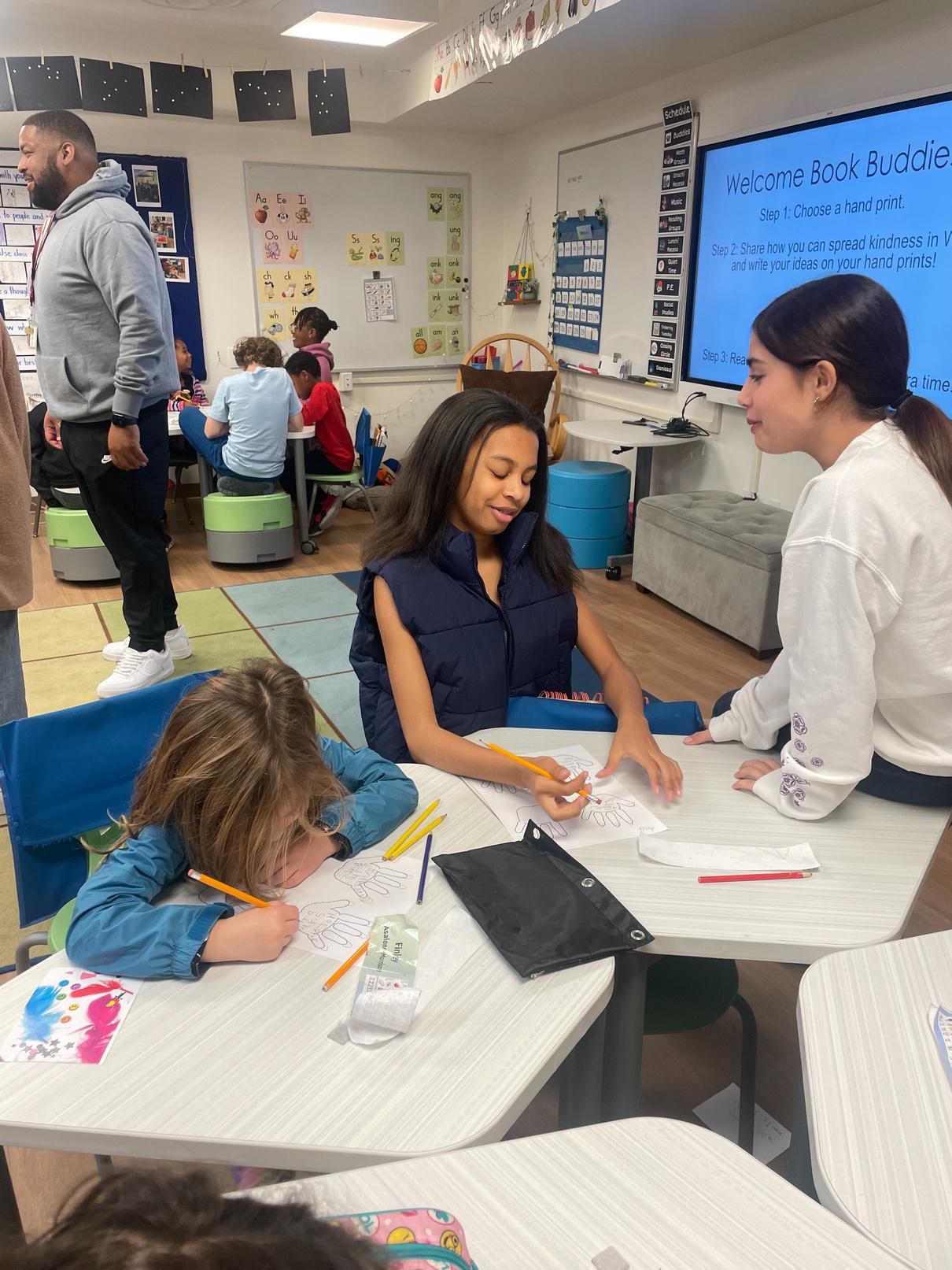 6th graders and 1st graders wrote in handprints how they could spread kindness to others. They had great conversations, shared ideas, and drew pictures. They then choose a book and spent time reading together.