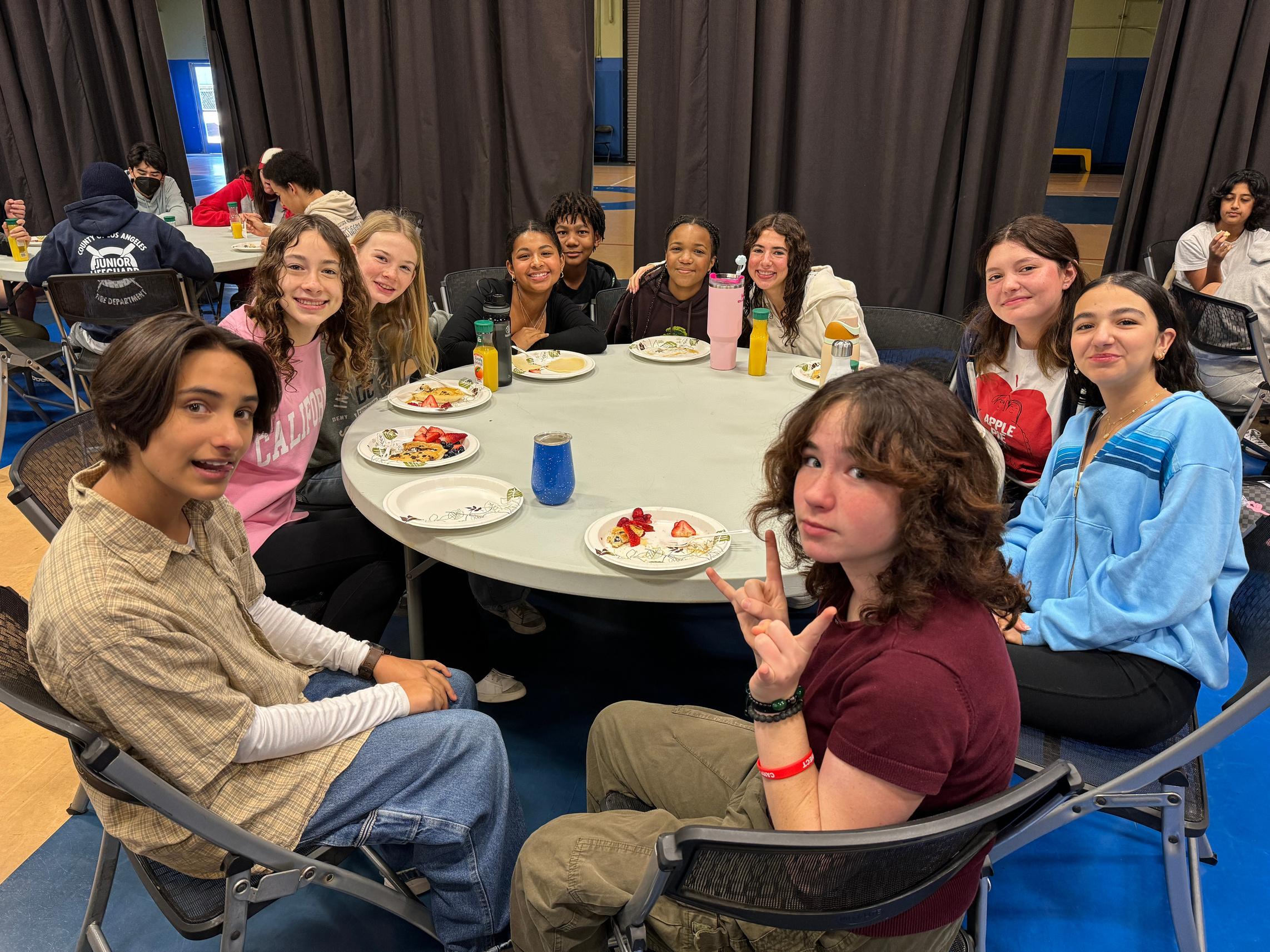 Eighth graders put in a lot of time and effort in their high school application process, interviews, and shadow days. In anticipation of hearing news from their high schools, they all gathered to enjoy some delicious breakfast, celebrate how far they’ve come and watch some of their favorite cartoons together while devouring delicious pancakes made by Mr. Zacuto, Ms. Reimann, and Mrs. Rod. Mr. Brannan happily served bacon and other accoutrement to the students, while the other eighth grade teachers and advisors enjoyed breakfast alongside the students. Since the breakfast, students have all heard back and have made their selections for high schools next year! We’re so proud of them all.