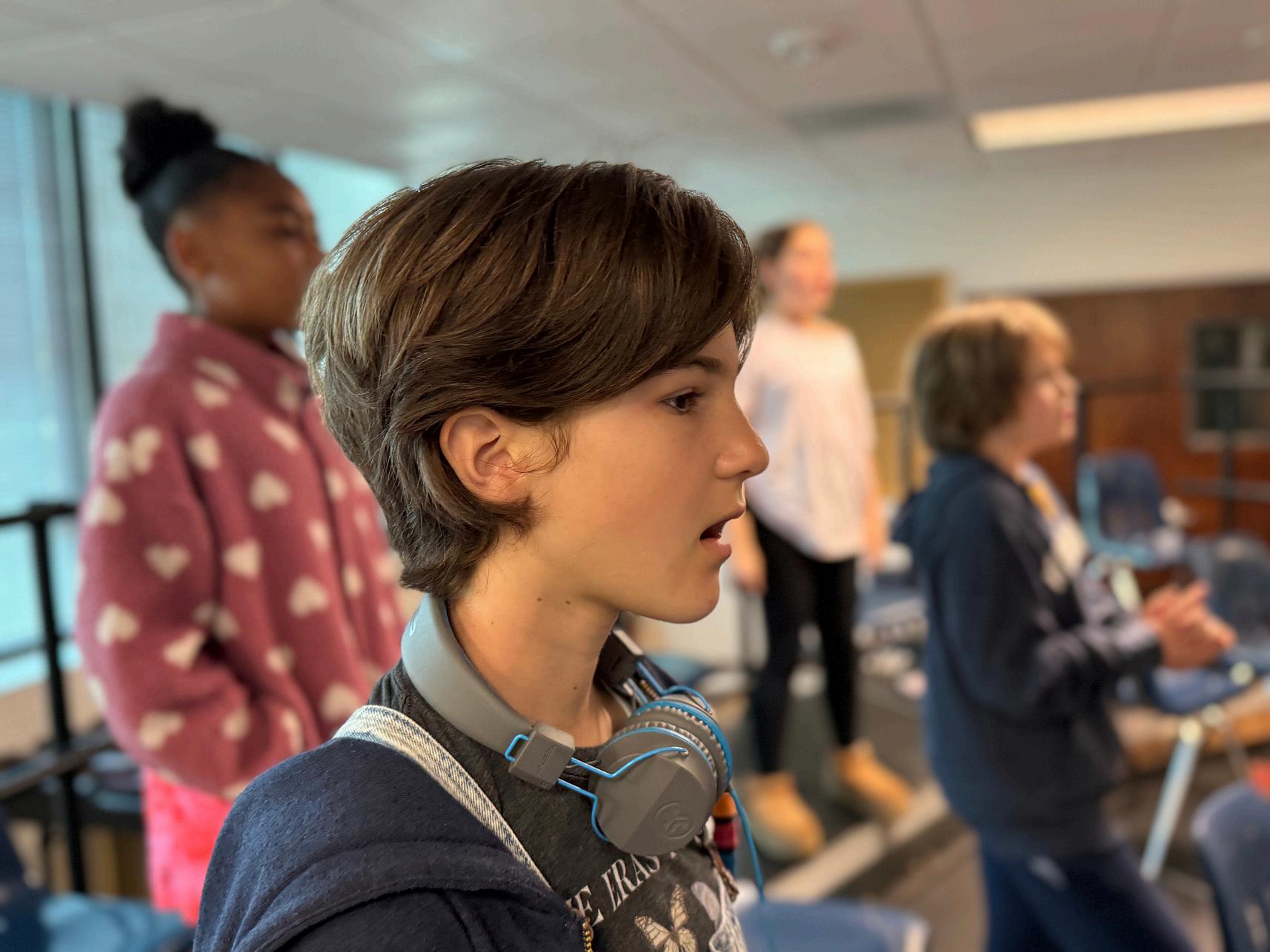 Eighth graders are working on their monologue unit. Each student selected a monologue to perform from either a movie, a tv show, or a play that is appropriate for school. They worked with partners to memorize their lines and work on breaking down the essence of their monologues. They discovered their objectives and examined tactics to get what they want from their ‘invisible scene partner’. Students will slate and perform these monologues for their peers in sections and we will videotape their performances. A highlights reel will be shared with families by Open House.