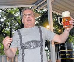 senden Gäste warteten und warteten. Zum Glück hatten sie Schutz vor dem Regenunter dem neuen Markisendach an der oberer Terrasse gefunden. Dann wurde kurzerhand entschieden, schon mal ein kleines Fass vom Gambrinus alias Thomas Stechhammer anstechen zu lassen. Auch die Bratwürste und das Kraut wurden schon mal bestellt. Gerade noch rechtzeitig vor dem Essen trudelte dann die Bürgermeisterin mit ihrem Stadtrat ein. Nach einer kurzen Begrüßung nahm sie den Bierschlegel in die Hand und brauchte nur drei Schläge, bis der goldene Gerstensaft in die Krüge floss Das Festbier werde in diesem Jahr auch beider