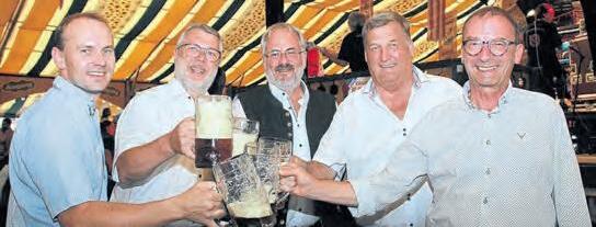 Festwirt Andreas Widmann, OB Jürgen Schröppel, Maximilian Hetznerund Karl-Heinz Degen vom Kirchweihausschuss mit Brauereichef Thomas Schneider Fotos: Amadeus Meyer und „Freiwein im Weinzelt