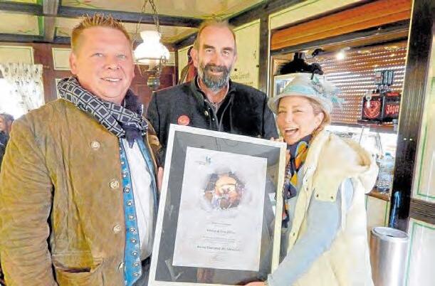 Den Festplatzorganisatoren Sabrina und Timo Zöllner wurde 2022 für ihre Treue und den unermüdlichen Einsatz rund um die Gunzenhäuser Kerwa der Titel „Kerwa-Traumpaar des Jahrzehnts“ verliehen. (v.l.: Timo Zöllner, WolfgangEckerlein, Sabrina Zöllner) Foto: Horst Kuhn