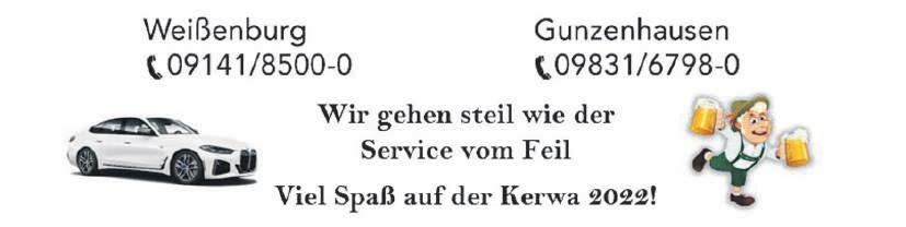 ben, Spaß haben, Freunde treffen, dassüffige Bier und die fränkischen Leckereien genießen, getreu dem Motto: „Af die Körwa mouß mer göih!“ Für einen gelungenen Kerwa-Spaß und ein paar schöne Stunden werden auch das Festzelt Widmann und das Weißenburger Weindorf sorgen.