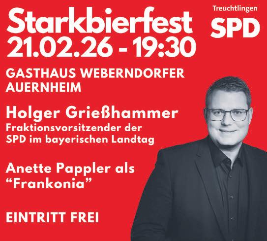 Auernheim (red). Dieses Jahr lädt die Treuchtlinger SPD zum traditionellen Starkbierfest mit zünftigen Reden und Wirtshausmusik wieder nach Auernheim ein. Am Samstag, 21. Februar 2026, 19.30 Uhr wird im Saal des Gasthauses Weberndorfer wieder dassüffige Fastengetränk der einheimischen Brauerei Strauß zum Ausschank kommen.