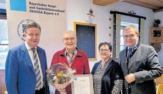 Bezirksvorsitzender Thomas Domani bedankte sich im Namen des Landesverbandes für die langjährige Treue sowie die Weiterführung des elterlichen Betriebs und überreichte die Urkunde zusammen mit einem Blumenstrauß In ihren Grußworten bedankten sich HansDieter Niederprüm vom Tourismusverband Fränkisches Seen-