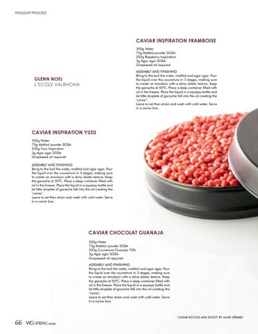 CAVIAR INSPIRATION FRAMBOISE 300g Water 75g Maltitol powder SOSA 200g Raspberry Inspiration 3g Agar agar SOSA Grapeseed oil required ASSEMBLY AND FINISHING Bring to the boil the water, maltitol and agar agar. Pour the liquid over the couverture in 3 stages, making sure to create an emulsion with a shiny elastic texture. Keep the ganache at 50°C. Place a deep container filled with oil in the freezer. Place the liquid in a squeezy bottle and let little droplets of ganache fall into the oil creating the ‘caviar’. Leave to set then strain and wash with cold water. Serve in a caviar box.