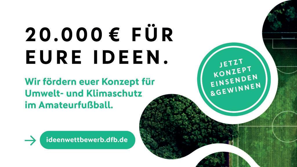 Bis zum 08.11.2024 können Amateurvereine ihre Ideen für Klimaschutz und ökologische Nachhaltigkeit in ihrem Verein auf ideenwettbewerb.dfb.de für den Wettbewerb „Anstoß für Grün“ einreichen. Damit landen sie im Topf um ein Preisgeld von 20.000 Euro für weitere Umsetzungsmöglichkeiten. Acht Vereine schaffen es in die engere Auswahl und dürfen zur Preisverleihung am 07.12.24 am DFB-Campus in Frankfurt erscheinen. Wir sind gespannt, ob Vereine aus Schleswig-Holstein dabei sein werden!