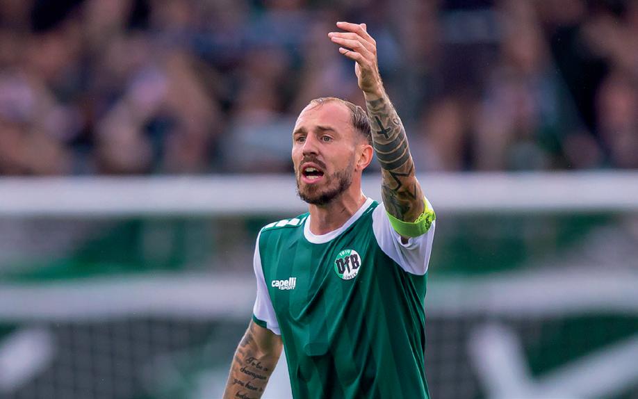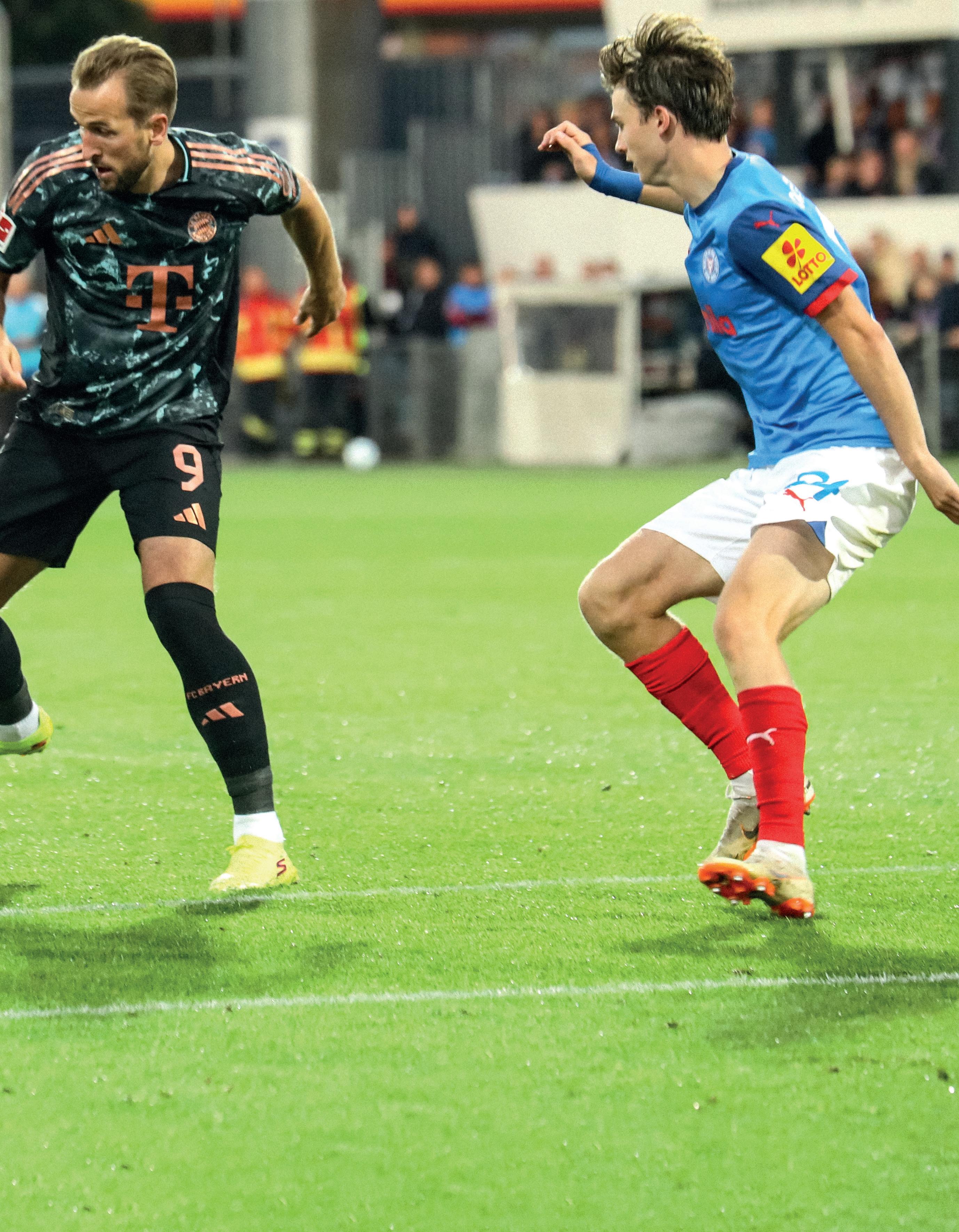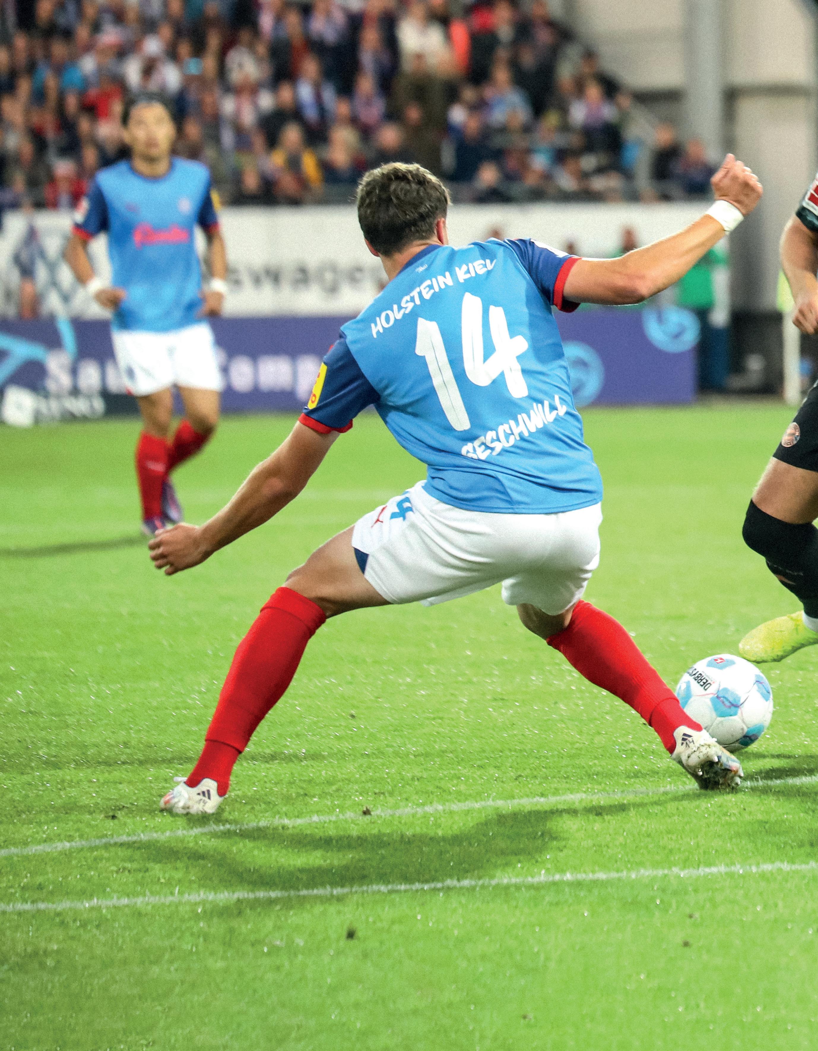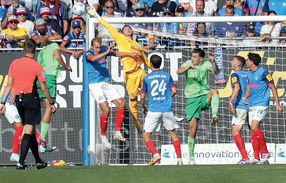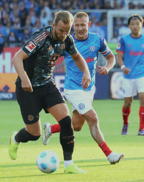 Stürmische Zeiten im „Wohnzimmer“ von Neu-Bundesligist Holstein Kiel. Am 14. September reiste der Rekordmeister Bayern München in den hohen Norden. Zur Topspiel-Zeit waren Manuel Neuer, Joshua Kimmich und Co. in der schleswig-holsteinischen Landeshauptstadt gefordert. Bereits nach 14 Sekunden traf Jamal Musiala ins Schwarze – zum drittschnellsten Tor in der Bundesliga-Geschichte. Nach Abpfiff stand ein 1:6 (0:4) auf der Anzeigetafel. Harry Kane (Mitte, hier gegen Max Geschwill (li.) und Magnus Knudsen) wirbelte die KSVDefensive ordentlich durcheinander, erzielte drei Treffer. Aus Kieler Sicht historisch: Armin Gigovic markierte in der 82. Minute das erste Bundesliga-Tor im heimischen Stadion.