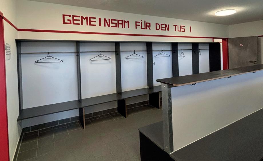 Blick in die Kabine: Es riecht an diesem Mittag nach Rasen vom Training am Vorabend. Alles erstrahlt in den Vereinsfarben, Rot und Weiß. Über den Kabinenschränken sind LED-Lichter angebracht. Auf der Wand steht in deutlicher Schrift der Leitsatz: Gemeinsam für den TuS!