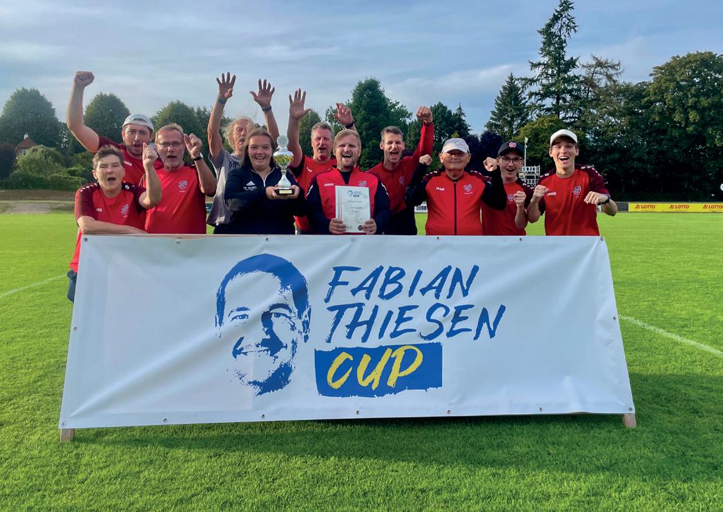 Bereits vor dem Turnier stand fest, dass keine hohen Siegprämien ausgeschüttet oder Präsente verteilt werden sollten. Im Gegenteil: Das Turnier war eine Veranstaltung für den guten Zweck! Sowohl die Anmeldegebühren der Teams, die sich mit je 42 Euro aus Fabians Alter ergaben, als auch die Abrechnung der Schiedsrichter*innen werden im Nachgang an die Schleswig-Holsteinische Krebsgesellschaft gespendet. Das Thema Blutkrebs war am Sonntag ebenfalls präsent. So konnte man sich an einem kleinen Infostand der DKMS über die Krankheit, den Verlauf und Hilfsmöglichkeiten informieren und gar als Spender*in registrieren. ■