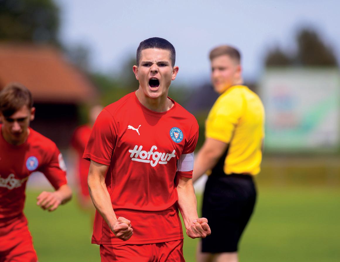 Viel Spannung hielt das Landespokalfinale der A-Junioren bereit: Hier traf DFB-Nachwuchsligist Holstein Kiel auf den Regionalligisten JFV Lübeck – und tat sich anfangs schwer. Zur Halbzeit führten die Hansestädter mit 1:0, weil sich Lennox Zapels Freistoß (45.+3) kurz vor dem Pausenpfiff als gefährlicher Aufsetzer entpuppte und in den Maschen landete. Doch Holstein kam nach dem Seitenwechsel zurück in die Partie. Islam Matene (58.) und Doppelpacker Kian Tack (66., 88.) drehten die Begegnung zugunsten der Kieler auf 3:1 (0:1), die damit nicht nur das Holstein-Quadruple perfekt machten, sondern darüber hinaus das Ticket für den DFB-Pokal buchten. ■