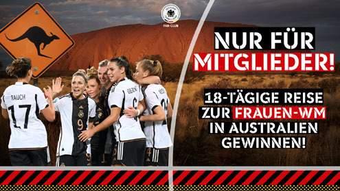 Wenn die DFB-Frauen im kommenden Sommer bei der Weltmeisterschaft antreten, werden zahlreiche Fans das Team von Martina Voss-Tecklenburg in Australien unterstützen. Und mit etwas Glück fliegst auch du mit einer Begleitperson deiner Wahl nach „Down Under“! Der Fan Club Nationalmannschaft verlost exklusiv unter seinen Mitgliedern eine 18-tägige Reise (20. Juli bis 6. August) zu den drei Gruppenspielen der Mannschaft. Auch neue Mitglieder können am Gewinnspiel teilnehmen. Nach deiner Anmeldung im Fan Club Nationalmannschaft erhältst du umgehend und automatisch deine Mitgliedsnummer, die beim Anmeldeformular des Gewinnspiels angegeben werden muss.