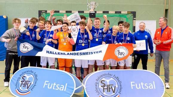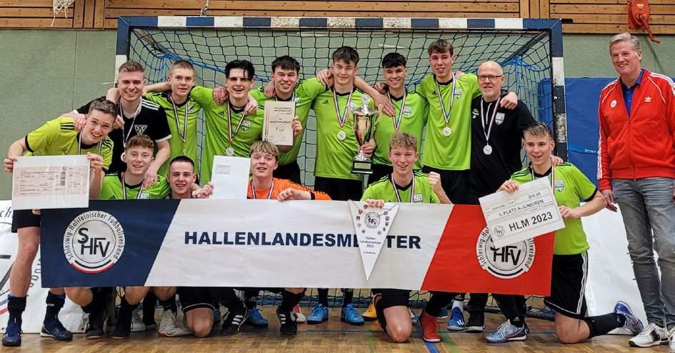 Der erste Hallenwettbewerb auf Landesebene wurde in Henstedt-Ulzburg gespielt. Hier traten zunächst zehn Kreismeister der B- und anschließend ebenfalls zehn Kreismeister der A-Junioren an, um die SHFV-Hallenkrone 2023 auszuspielen. Der erste Torjubel des Tages ertönte im Fanlager des Husumer SV, der sich etwas überraschend bis ins Spiel um Platz 3 gegen den TSV Kronshagen kämpfte und dort aufgrund einer schwereren Verletzung einen Spielabbruch und damit den vierten Platz vorzog. Im Finale trafen mit dem Heider SV und dem TuS Nortorf die beiden Gruppensieger erstmals aufeinander. Die Jungs von der Westküste, die bis zu diesem Zeitpunkt jedes ihrer Spiele für sich entscheiden konnten, taten sich schwer im packenden Finale gegen die Überraschungsmannschaft aus dem KFV Holstein. So konnte sich in den 12 Spielminuten kein Sieger herauskristallisieren und der Hallenlandesmeister musste im Entscheidungsschießen ermittelt werden. Hier zeigte sich der Landesligist einen Tick kaltschnäuziger im Vergleich zum Oberligisten aus Heide und der Titel wanderte mit einem 4:3-Endstand nach Entscheidungsschießen aus der Hand von Vizepräsident Sönke Anders in die Hände der Nortorfer.