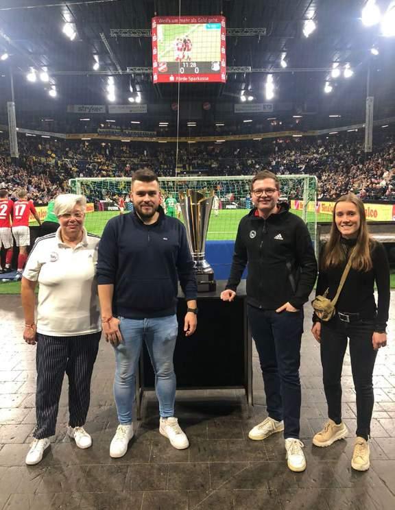 Im Vorfeld des LOTTO Masters hatte der SHFV-Ausschuss für Ehrenamt und Freiwilligenmanagement zum gemeinsamen Kaffeetrinken in das Kieler „Haus des Sports“ eingeladen. Ulrike Krieger, Vorsitzende des Ausschusses, nahm die Ehrung vor und fand lobende Worte für das ehrenamtliche Engagement. So ist Marc Hirsch seit 2018 Fußballobmann des SC Kalübbe und setzt sich maßgeblich für den Fußballsport ein. Durch seine Arbeit unterstützt und entlastet er den Vorstand. Gründe genug, um den engagierten Obmann mit der Auszeichnung zum YoungStar zu würdigen. Im Anschluss an das Kaffeetrinken machte sich die Delegation auf den Weg in die Wunderino-Arena, um zunächst einen Blick hinter die Kulissen des größten Hallenfußballevents Deutschlands zu werfen und das Spektakel anschließend von den Rängen aus zu verfolgen. Janik Lange, Mitglied des Jungen Präsidiums des SHFV, war Teil der Delegation und blickte begeistert auf den Tag zurück: „Es war eine hervorragende Veranstaltung im Haus des Sports mit einem krönenden Abschluss bei den Hallenmasters 2023. Es hat allen Beteiligten großen Spaß gemacht!“