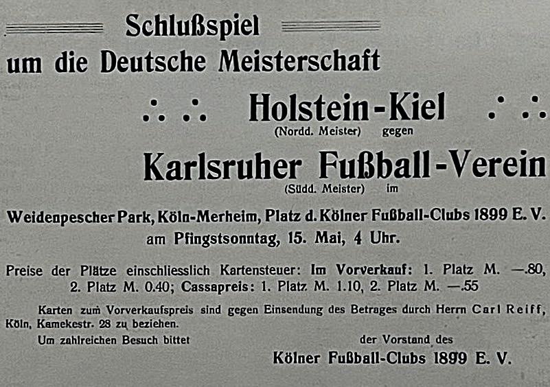Am 15. Mai 1910 trat der FV Holstein im Weidenpescher Park in Köln gegen den Karlsruher FV erstmals im Finale um die Deutsche Meisterschaft an. Vor rund 5.000 Zuschauer*innen unterlag Holstein mit 0:1 nach Verlängerung. Ein Jahr später scheiterte Kiel im Halbfinale an Viktoria Berlin.