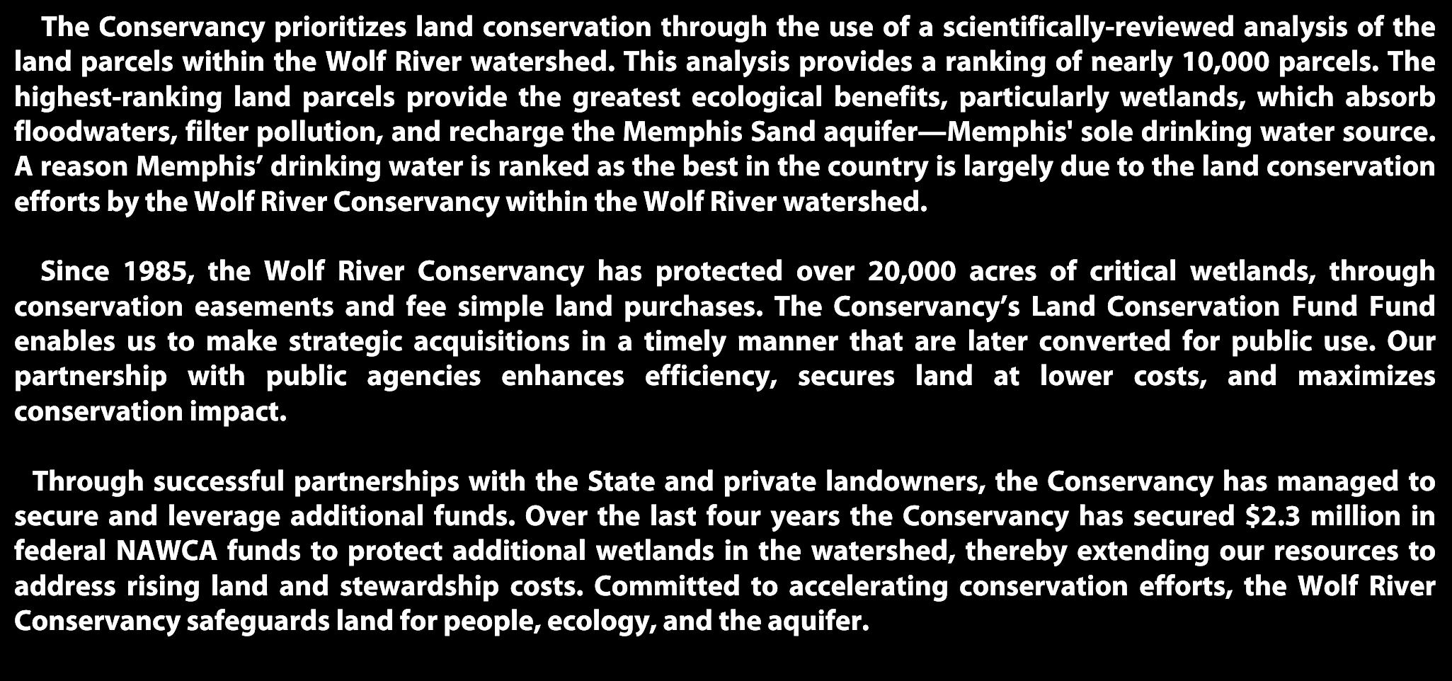 The Wolf River Conservancy is the only nationally accredited land trust headquartered in West Tennessee. As a 501c3 non-profit, it is committed to protecting and preserving the Wolf River watershed as a sustainable natural resource. The Wolf River watershed is critical to the health and well-being of the greater Memphis community. More than one million residents obtain their drinking water from the Memphis Sand Aquifer and it is a vital resource for the development of the region. The Wolf River watershed contains some of the highest quality wetlands that recharge the Memphis Sand Aquifer.