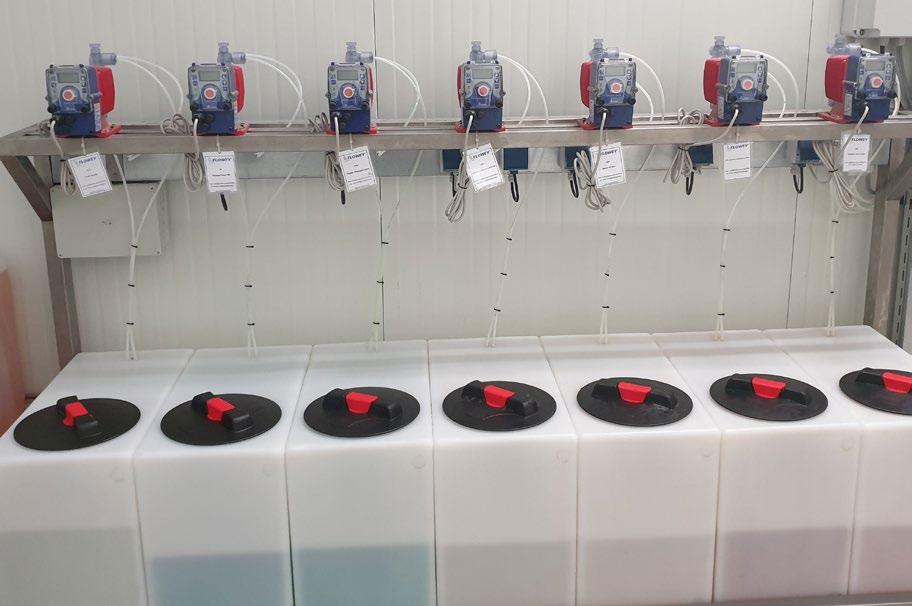 • In een aangrenzende ruimte staan in een L-vorm alle chemie pompen op hiervoor speciaal gemaakt platforms. Dat maakt alles ruimtelijk en overzichtelijk.