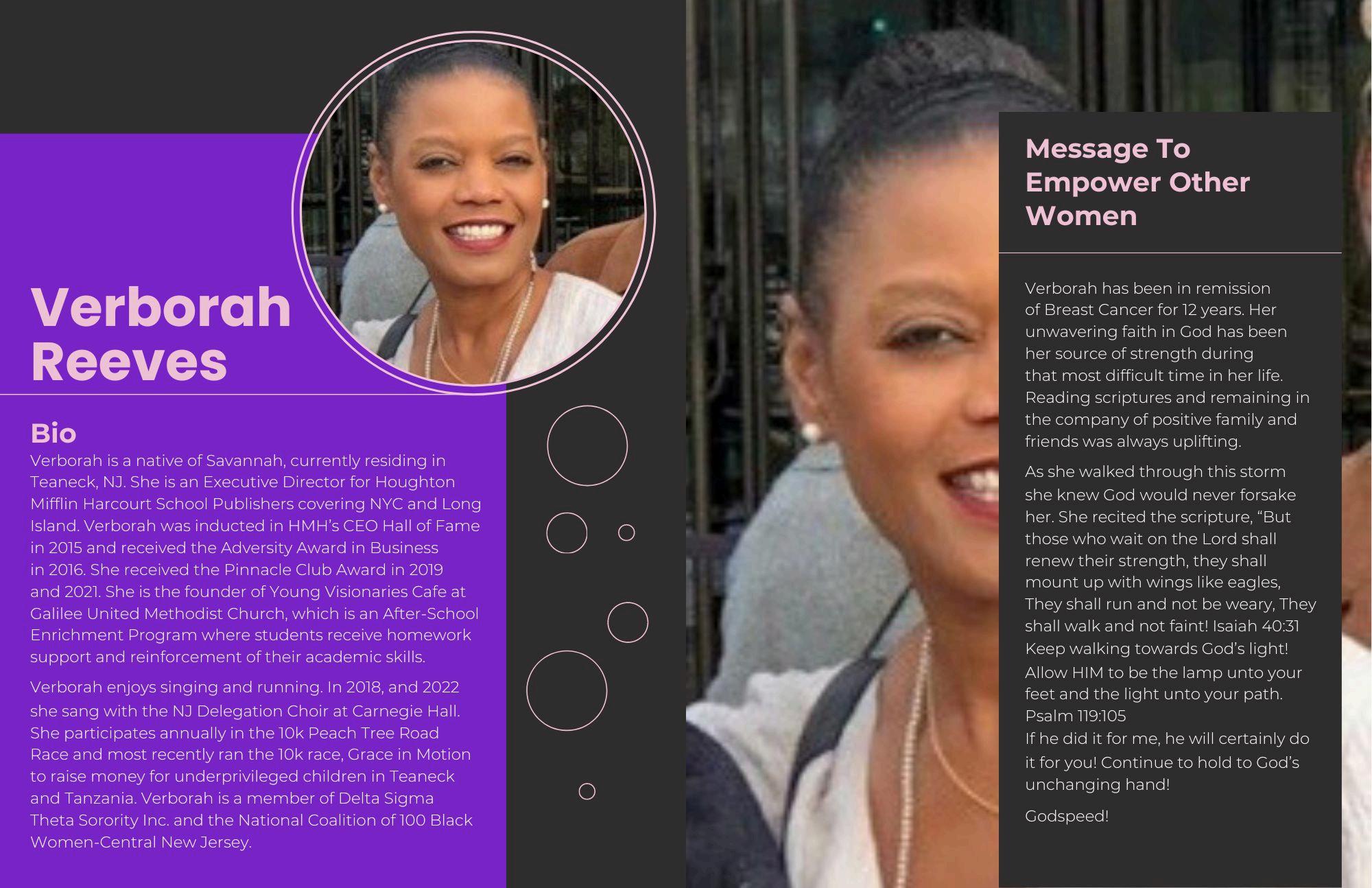 I’m a 57 years old Wife, Mother, MiMi, Daughter, Sister, Aunt, Niece, Cousin and Genuine Friend!! I love God and I love my family. On February 1, 2007, I was diagnosed with Stage II Breast Cancer I underwent surgery and had a “Lumpectomy” performed on my right breast Thereafter, I had to complete 6 months of weekly Chemotherapy then 4 weeks of daily Radiation treatments It came, I fought and I WON!! After 32 years working for the Federal Courts, I recently retired, relocated to Savannah from California and am now living my best life! My motto: “My PEACE is My Priority!”