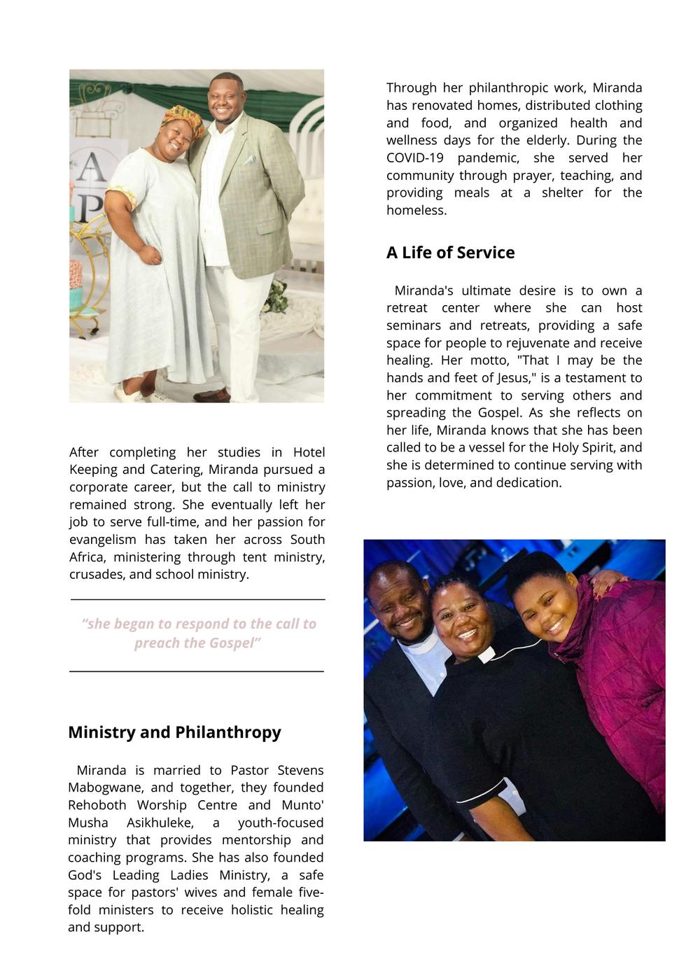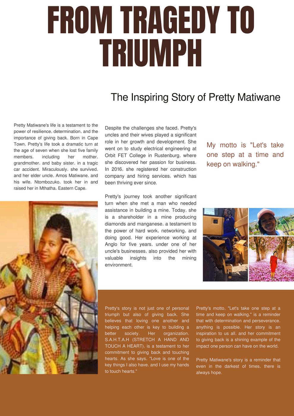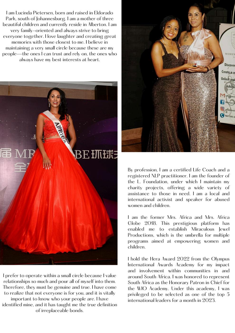 Ladies,andourgentlemenreadersofcourse, thisissueisbyfarourmostbeautifuland insightfulone.Ourfeatureandcoverstoryis thatofanexceptionalwoman,awoman whoseambitionsmakeseventhelaziest persontostoptheirlazytendenciesandstart afresh.ThismultitaskingbeautyQueenisnon otherthanMsLucindaPietersen,a formerMrsAfricaandMrsAfricaGlobe2018. ShehasalsowontheWLNawards overallwinnerfortheGautengProvince There’salsomorewinnersfeaturedinthis issue.Doreadupabouttheirstrengthand courage Welovelookinggoodalways,checkoutour beautycolumnandfinishyourreadingoff withourmouth-wateringrecipesthatwill leavingyouaskingformore.Aswomenwe alwayslookforwaystomakeourliveseasier, there’slotsofbusinessesinthisissueto helpmakeyourdaysmuchshorter Enjoy your read and remember to strive