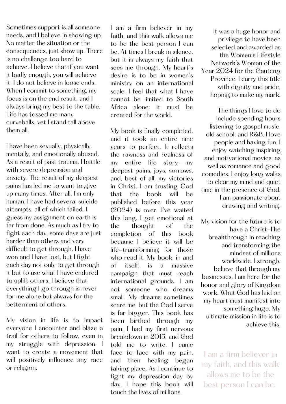 Happy women’s month to you our beautiful andstaunchsupporters,thewomenof worth, women who choose to change lives andourwarriors.Itiswithpridetosaythis magazine wouldn’t have lasted this long had itnotbeenforyou.Forthatreasonweat Women’sLifestylesaluteyou. We started off featuring and covering women’s stories and then we included our youth, both young ladies and young gentlemen. We havenowtakenitastepfurtherby including our wonderful support structure, our pillarsofsociety,ourawesomemale business owners in our upcoming Women’s LifestyleNetworkBusinessAwards.Do nominate your favourite business to show yoursupportandappreciationtothem