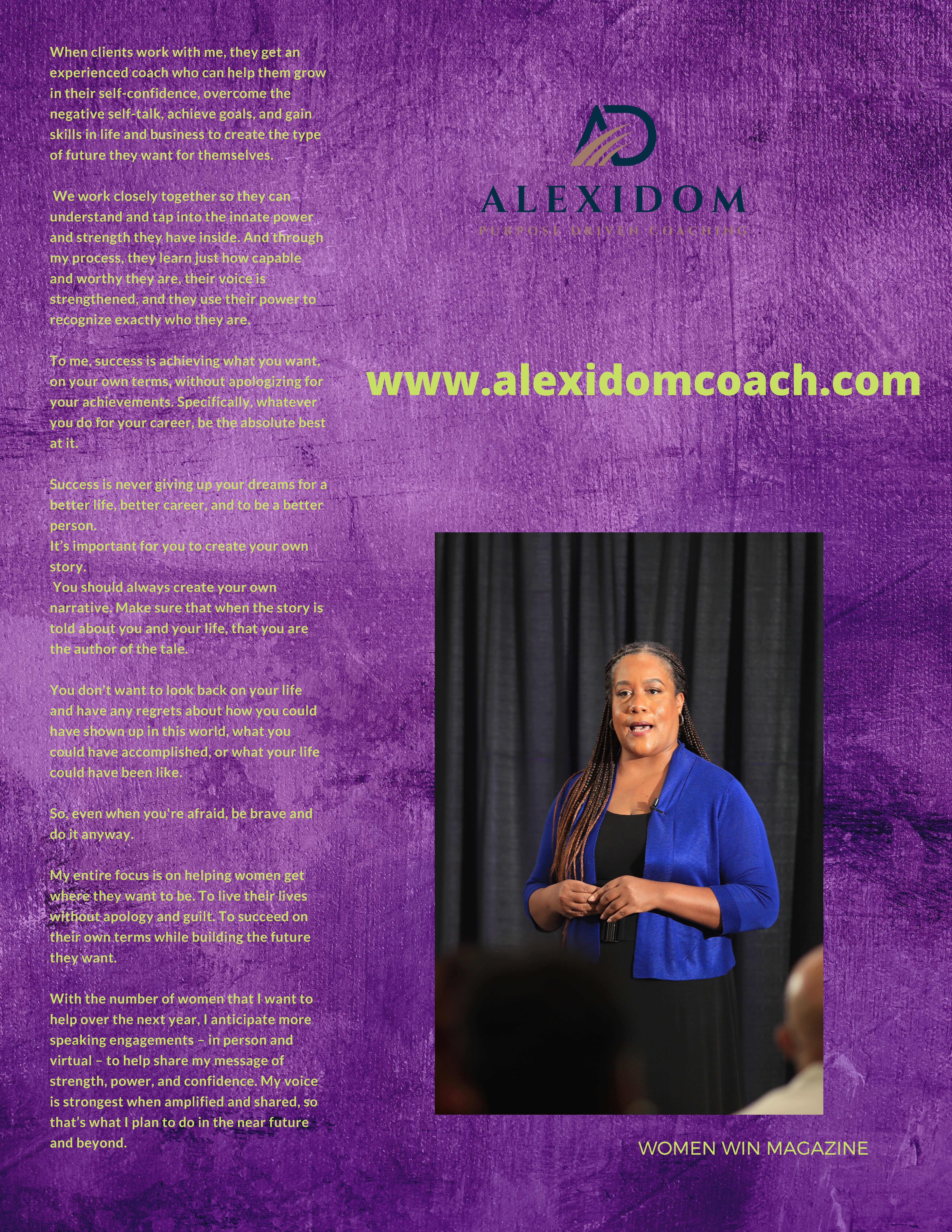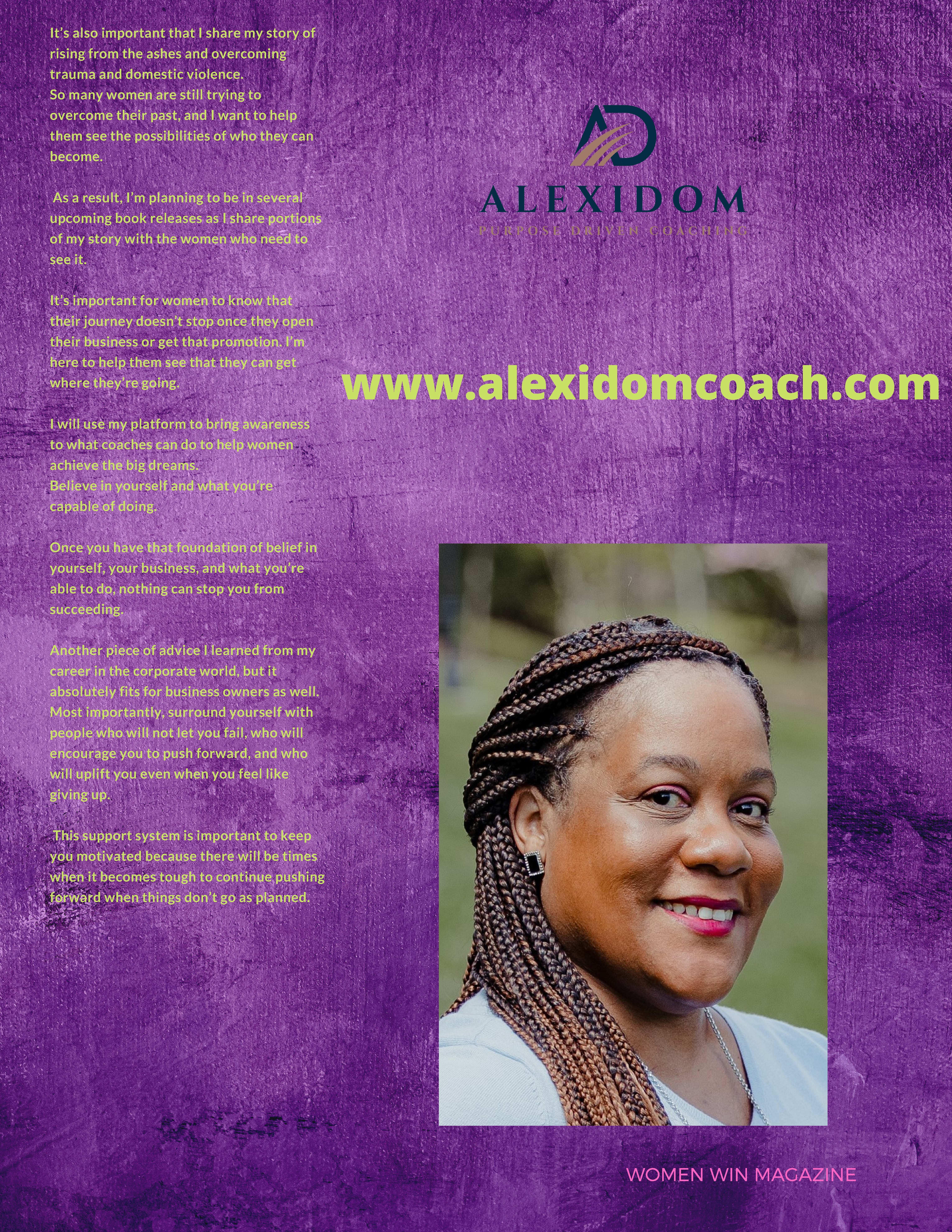 I’m an author, speaker, transformational life & success coach, and CEO and founder of Alexidom Coaching; a multifaceted coaching specialty centered around helping women increase their selfconfidence, reclaim their personal power, and rediscover their identity, so that they can successfully achieve their goals; and attain the life they desire most.