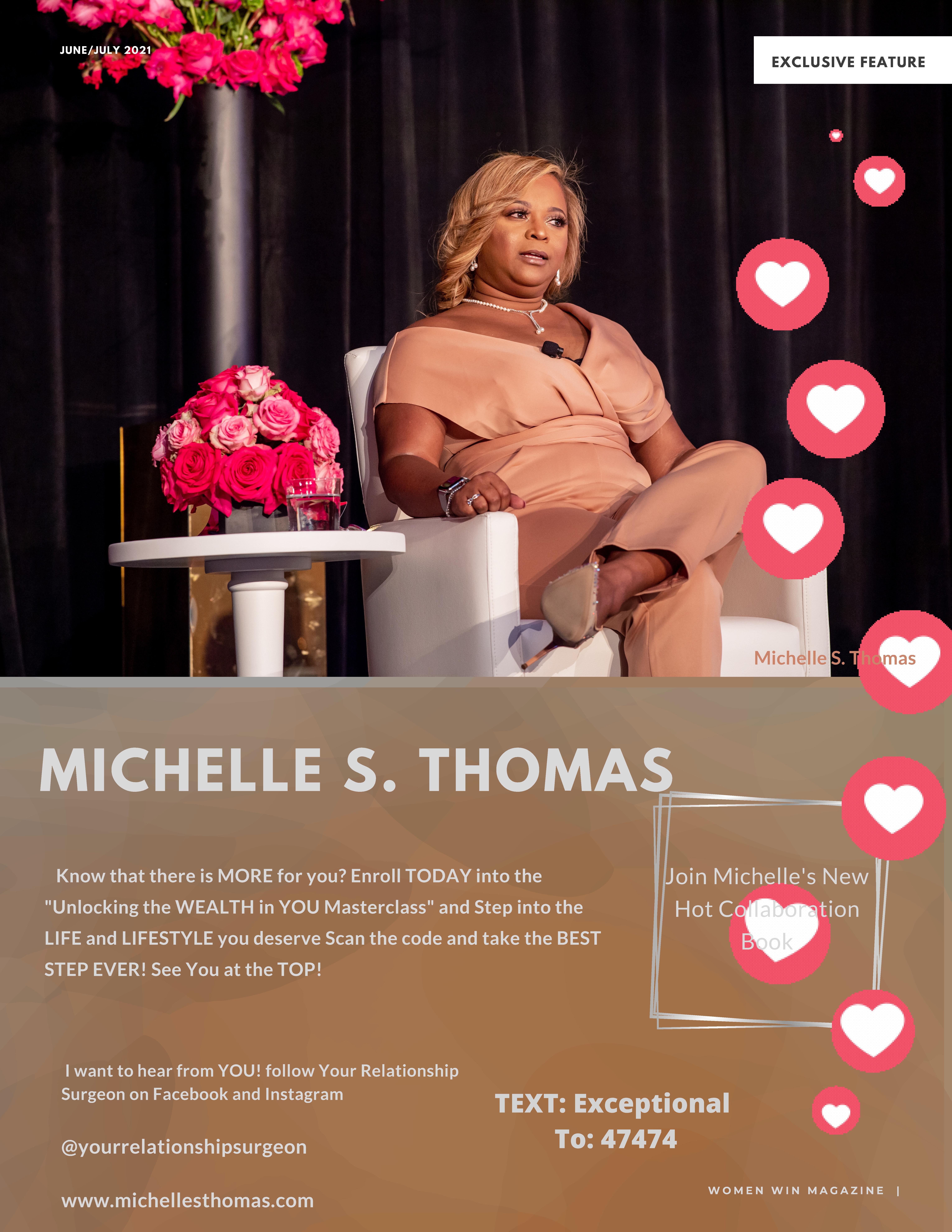 I am Michelle S. Thomas, Your Relationship Surgeon and I help individuals and businesses precisely remove what is infecting their ability to achieve peace, profits and prosperity while setting them on a permanent path to SUCCESS!