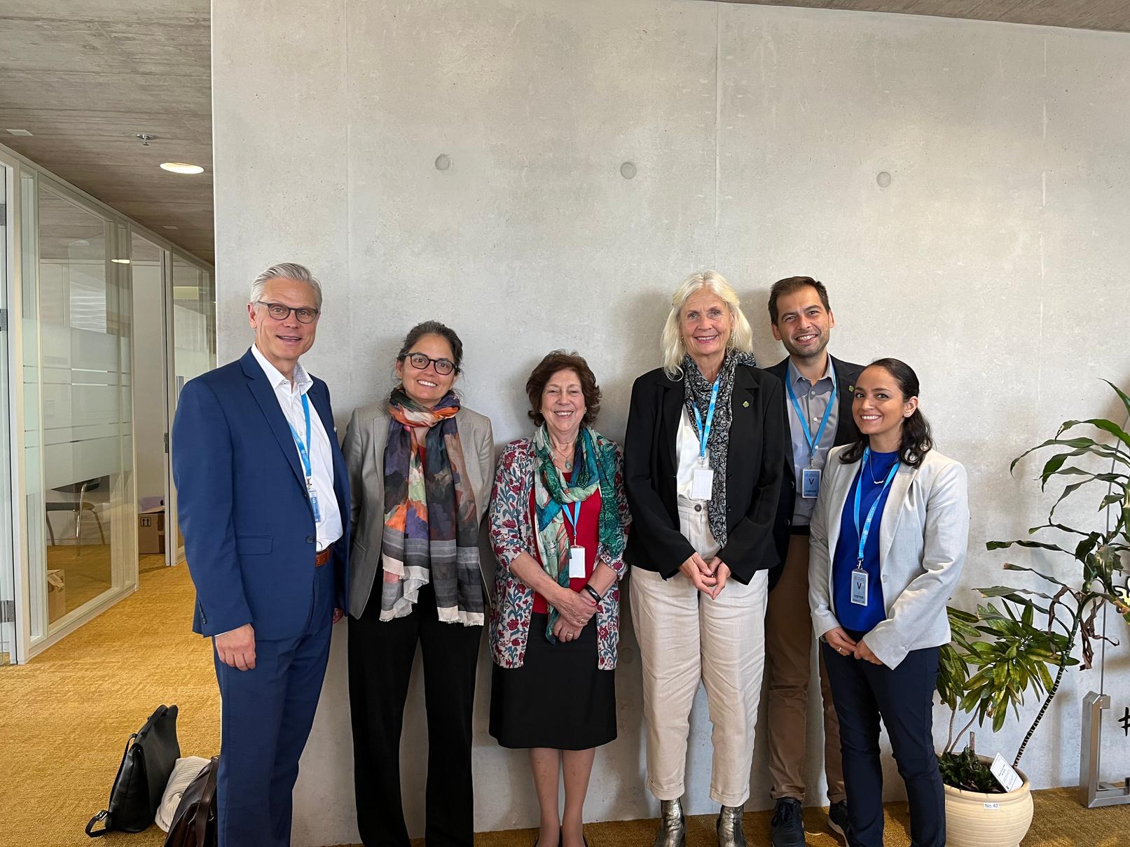 Dr Temo Waganivalu, Dr Slim Slama, WONCA President Anna Stavdal, Dr Bente Mikkelsen, WONCA CEO, Harris Lygidakis, and Professor Val Wass at the WHO headquarters in Geneva