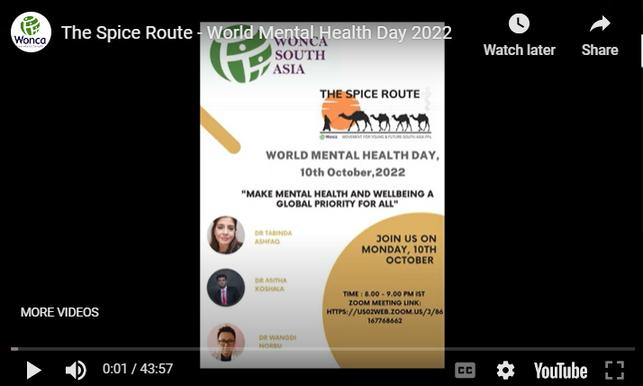 On the occasion of World Mental Health Day, the Spice Route Movement, a young doctors movementfromWONCASouthAsiaorganisedthe Webinar “Make mental Health and Well being a GlobalPriorityforAll”.