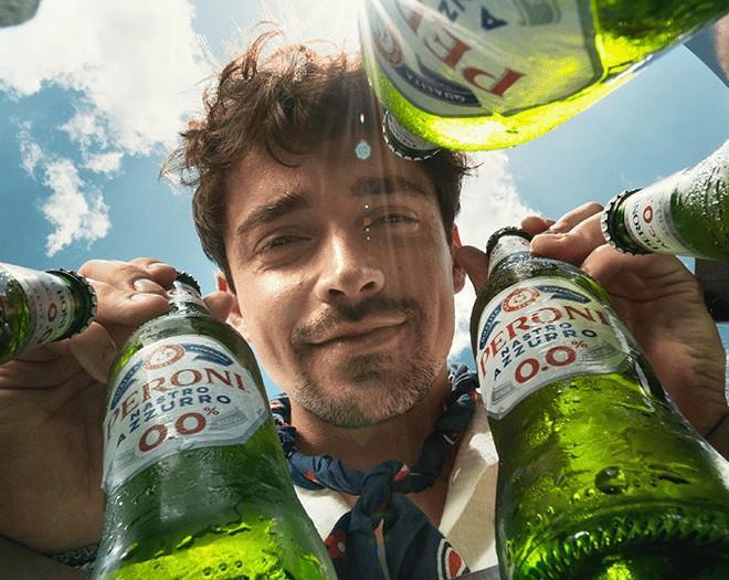 La nuova campagna, denominata "Da 0.0% a 100%", è un inno alla stessa filosofia del marchio, "Vivi ogni momento" Durante il suo lancio ufficiale, è stato presentato un cortometraggio che mostra Leclerc riproporre il suo famoso tuffo, “Hallelujah”, un momento celebrativo della sua vittoria nel Gran Premio di Monaco 2024, a glorificazione, questa volta, di una bottiglia di Peroni Nastro Azzurro 0 0% ghiacciata bevuta sul Lago di Como.