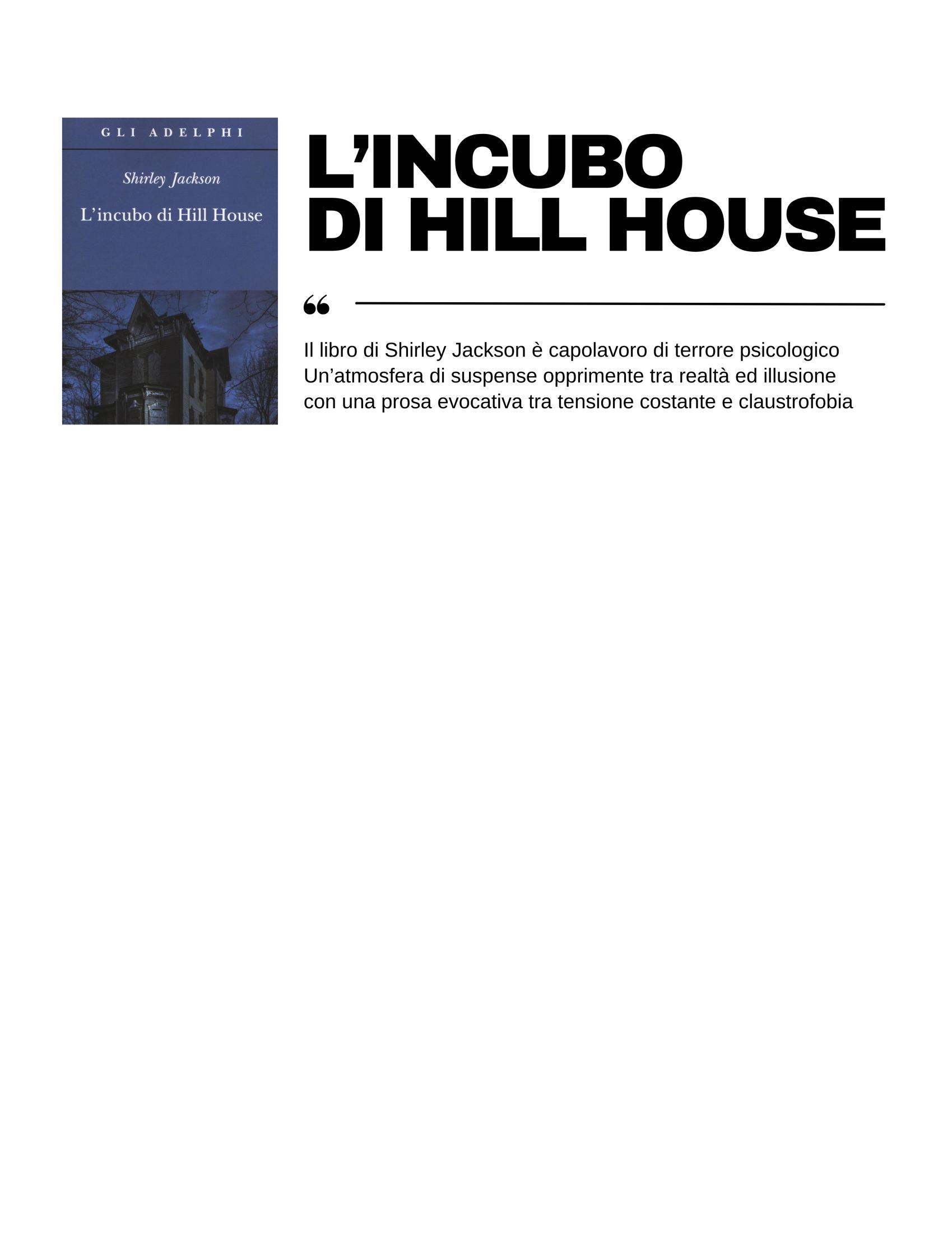 Considerato uno dei migliori romanzi horror mai scritti, “L’incubo di Hill House” di Shirley Jackson (1959) è un capolavoro di terrore psicologico. Un viaggio nelle zone più oscure dell’animo umano, dove la casa infestata diventa specchio della mente e della solitudine. Shirley Jackson crea un’atmosfera di suspense opprimente, con un linguaggio elegante ma spietato, carico di tensione psicologica che rende la casa una vera e propria entità maligna, lasciando sempre l’ambiguità su quanto di ciò che accade sia reale o frutto dell’immaginazione dei personaggi Il vero terrore, in fin dei conti, non ha bisogno di fantasmi urlanti o sangue a fiotti Spesso, la paura più grande si annida nella nostra stessa psiche, nel silenzio inquietante di una casa "non sana" che fa eco alla nostra solitudine interiore. Una casa che diventa un simbolo della mente umana.