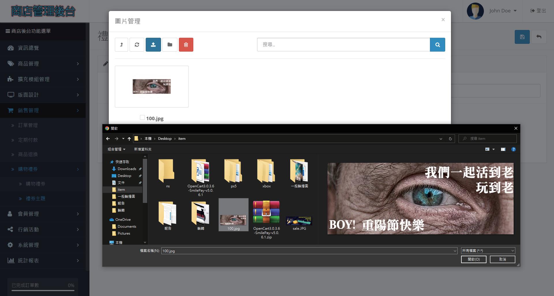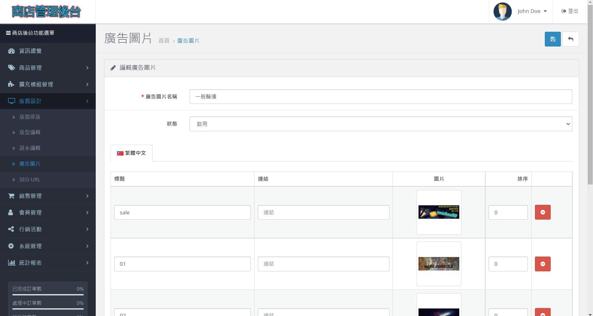 eg.促銷商品頁面之輪播想要使用銷售之圖片, 在此處新增輪促銷播圖檔,並在擴充模組管理 新增幻燈片輪播,並在版面排版設定促銷商品 分類頁面後,就可於前台顯示不同於一般輪播 之圖檔。