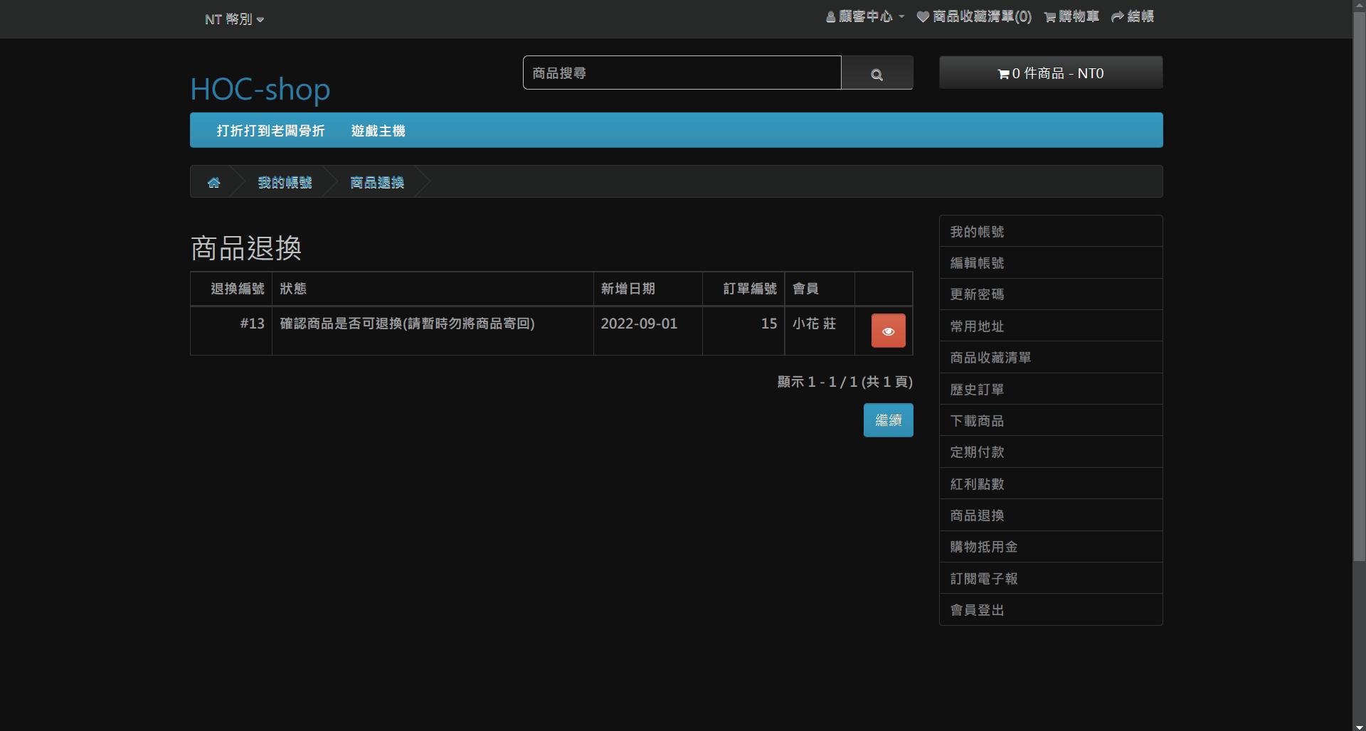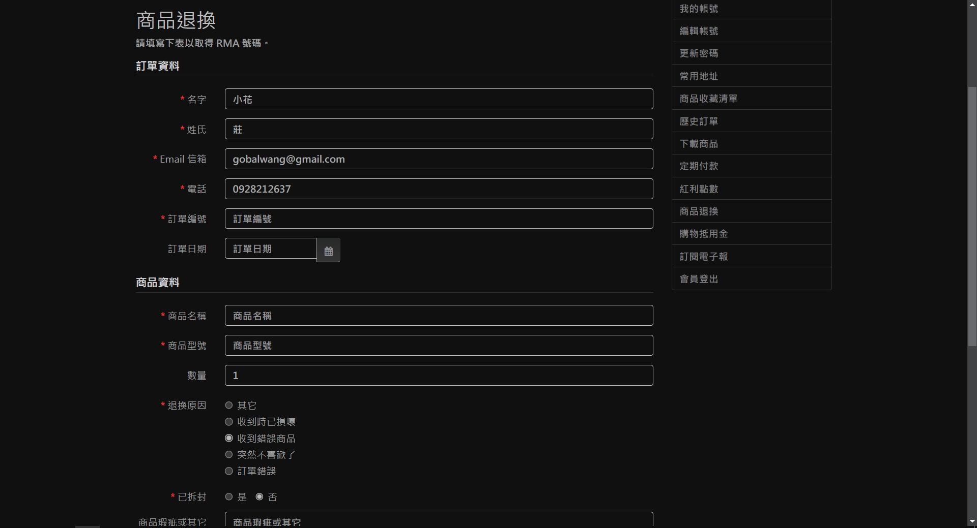 當顧客收到商品想退換貨時,需確認 是否為能退換之品項,並告知店家為何 需要退換貨,送出選單後,賣家設置之 mail及後台都會收到退換貨通知,並依據 狀況進行處理。