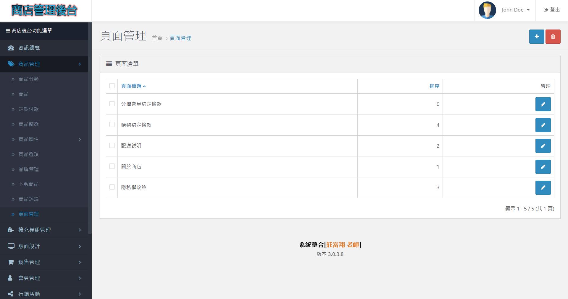 opencart提供強大的後台機制,可為架設者幫助 賣家提供各類介面管理,如圖為商品管理之 頁面管理,為賣家設置各類約定條款並依照排序 顯示在前台提供顧客閱覽。