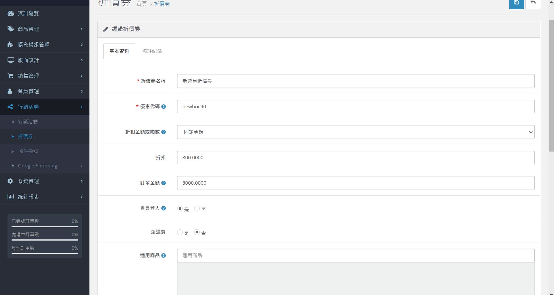 折價券可用於新會員或節日等同於回饋顧客,結帳時可輸 入折價券代碼進行折扣優惠,但須注意此處 如使用%為歐美銷售方式,80%等同於打兩折。