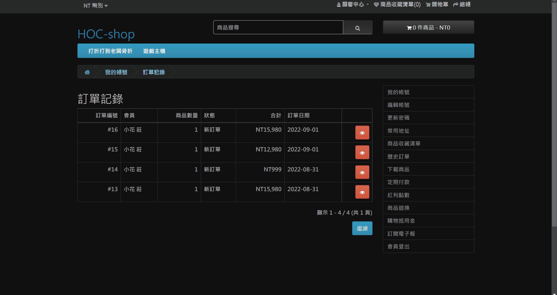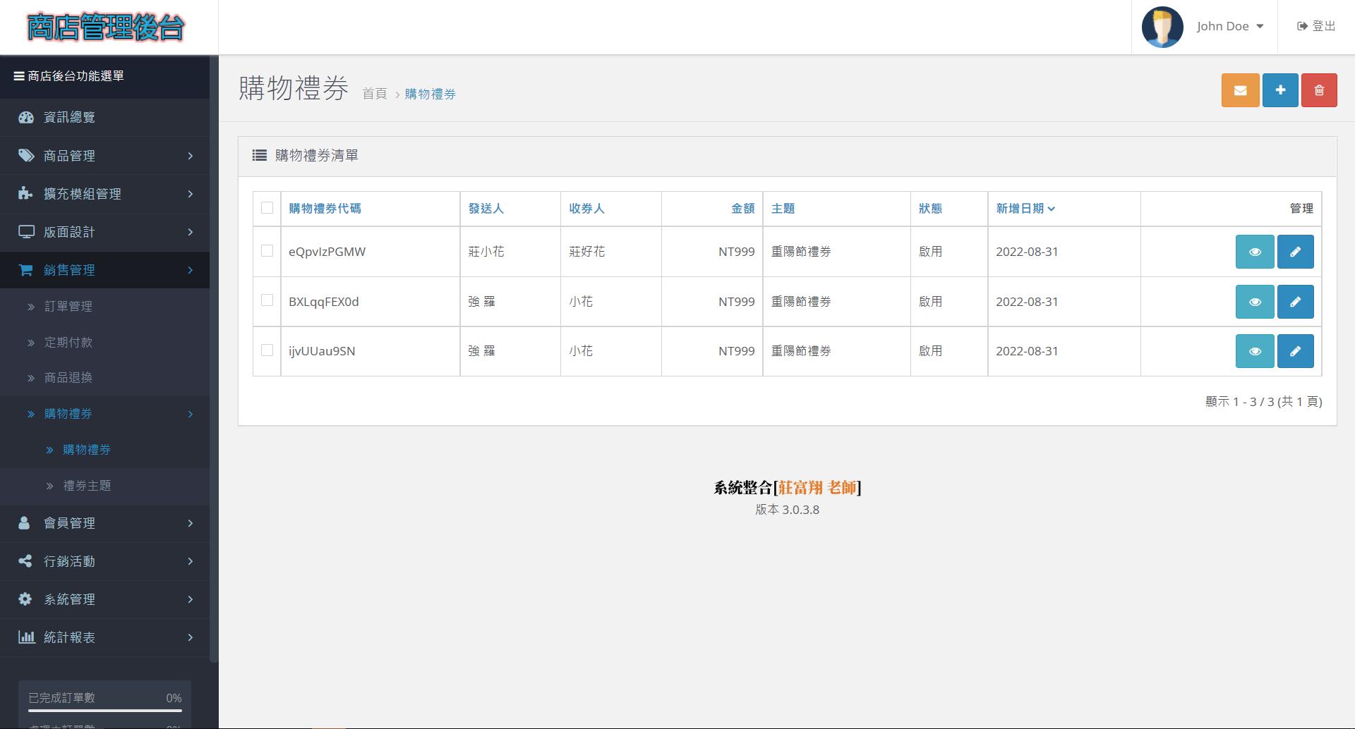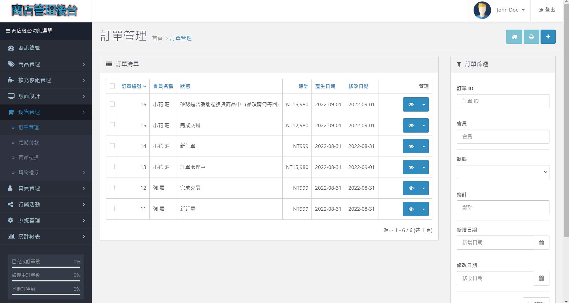 如圖為訂單管理,於此設置商品狀態, 並可增減狀態更能了解商品流向,並即時掌握, 下方亦有商品退換、購物禮券(買券送人使用) 等狀態,opencart將其整合為一個完善系統 提供商家可以容易的設置想要的銷售流程。