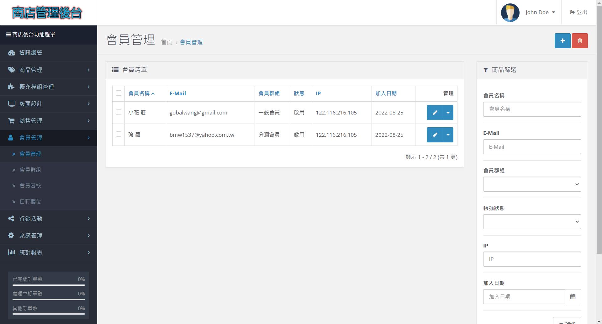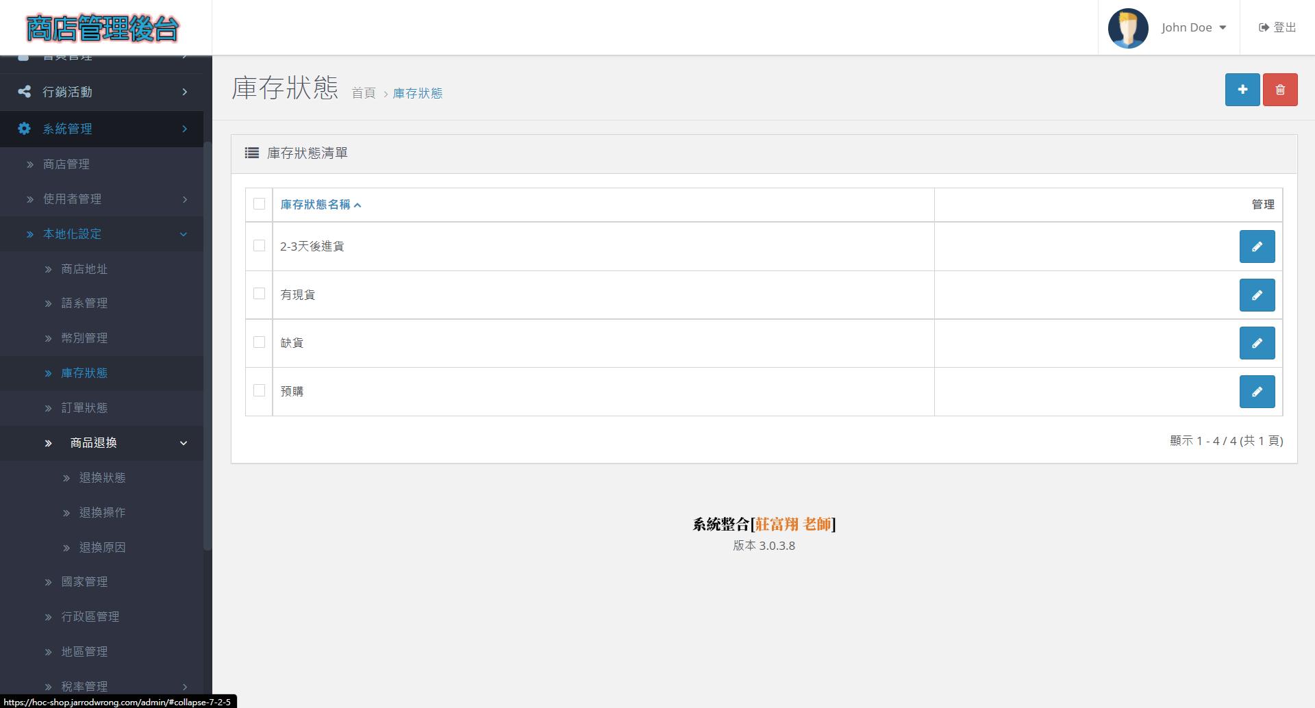 與擴充模組管理相同,主要為架站者操作, 並下放權限給賣家,如商店管理為整體賣場 基本資料及伺服器設定等較為細膩之設定; 可使用使用者管理新增賣場主理之權限,讓 其可以具有檢視權限但無修改權限,又如 賣家要新增庫存狀態(如 此商品需預購 )、 訂單狀態(如 此訂單商品目前卡海關中)、 商品退換(如 退換操作 新增到府確認品項)等, 這些為架站者處理的事項,權限即不須下放 給賣場主理,讓賣家能檢視到需要看見的資訊, 後端則為架站者處理好即可。