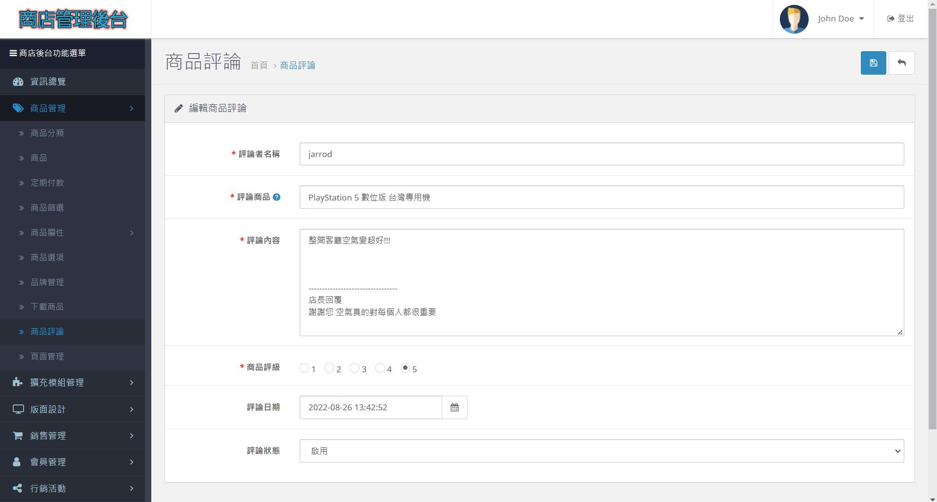 圖為顧客評論商品後,後台審核端會看到之介面, 另外雖可更改顧客之評價但缺乏公信力節後續爭端, 不建議修改顧客之評論,亦可聯繫顧客請對方重新 給予評價,亦或將此評論設為隱藏(見仁見智),另外 opencart也很貼心為賣家可以提供自家商品評論, 給予吸引顧客購買之誘因。