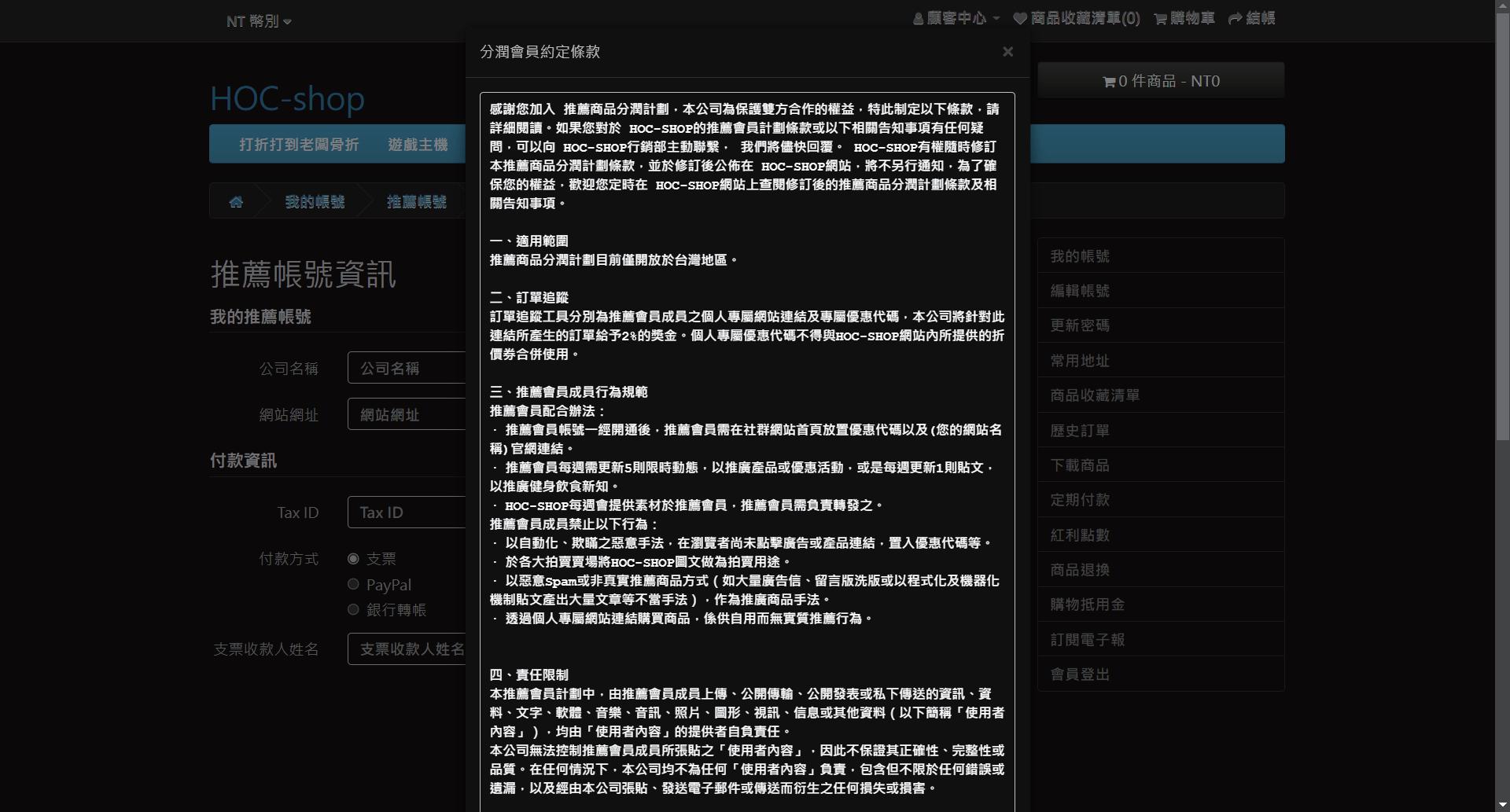 可設置各類條款及細則,供顧客確認, 如圖為分潤會員條款,一般會員申請 為分潤會員後,將商品頁面依分潤會員區 產生之網址分享後,獲得回響並且有他人 購買之,則店家可提供紅利金及與分潤會員, 藉此讓產品能讓更多人分享出去。