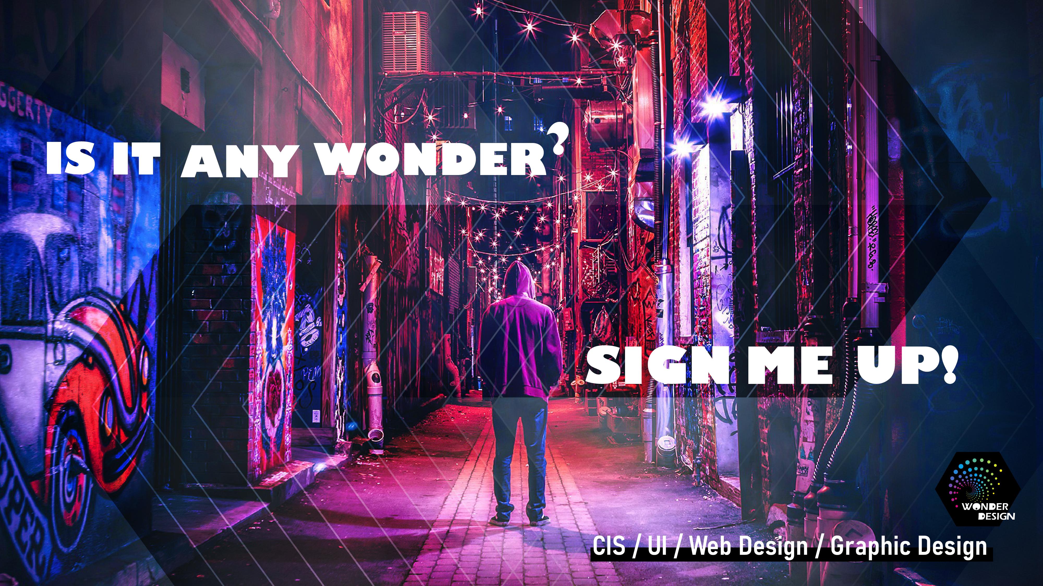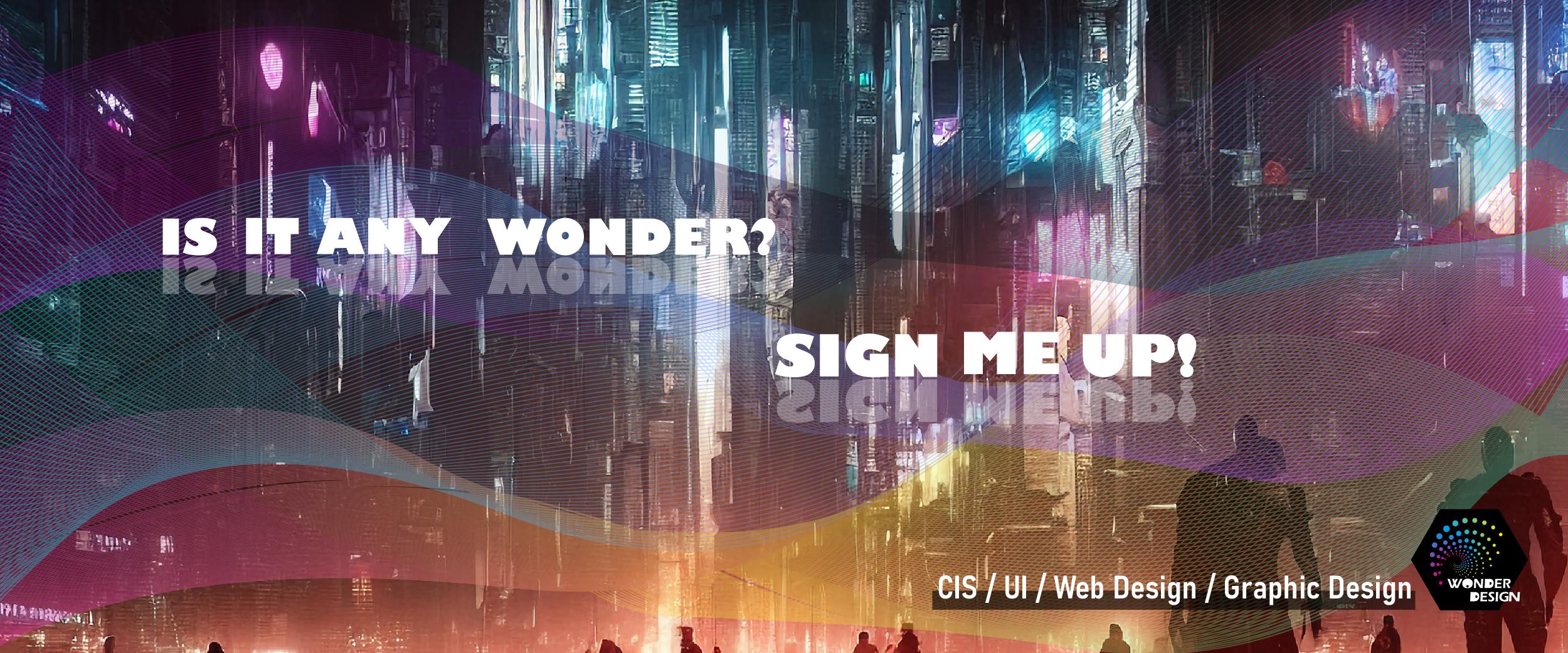 主要色彩商標結構 次要色彩商標結構 次要商標為輔助主要商標作為版型延伸, 以利運用於多元版型設計。 以斑斕為主要出發點, slogan為 is it any wonder?(這有問題嗎?) sign me up(算我一份) 應用在網頁banner上。