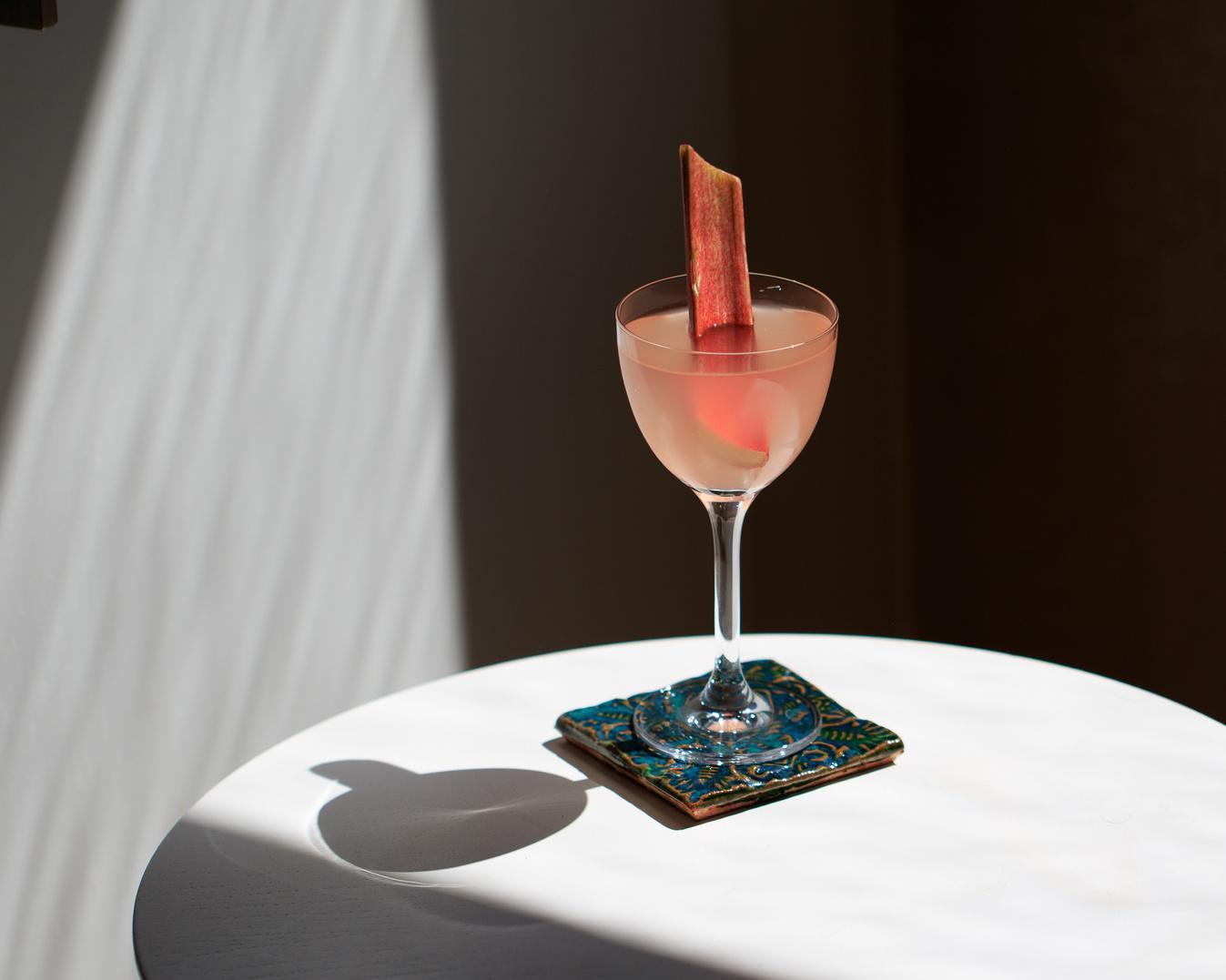 doe wat ijs in het glas en voeg de mojito toe. doe een dun sneetje rabarber in het glas en daar is jouw sunset mojito!!