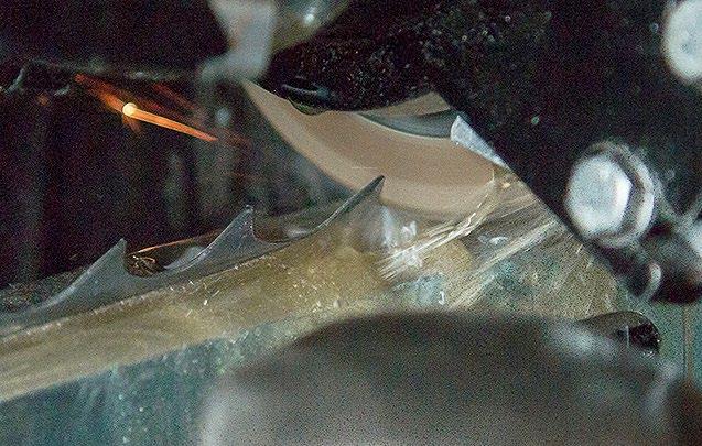 halkeamat johtuvat teränohjainrullien väärästä säädöstä. Terän rungon selkäosa koskee teränohjainrullan kaulukseen jatkuvasti, mikä johtaa terän rungon kuumenemiseen ja halkeamaan selkäpuolelta.
