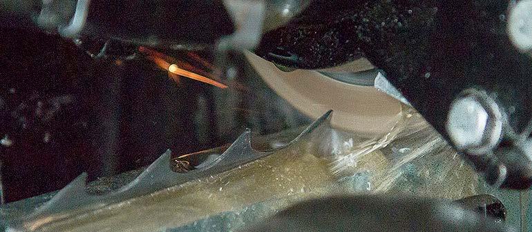 3a. În acest caz, pânza se fisurează în locul indicat în imagine. Motivul este reprezentat de capul mașinii de ascuțit care a fost setat incorect.